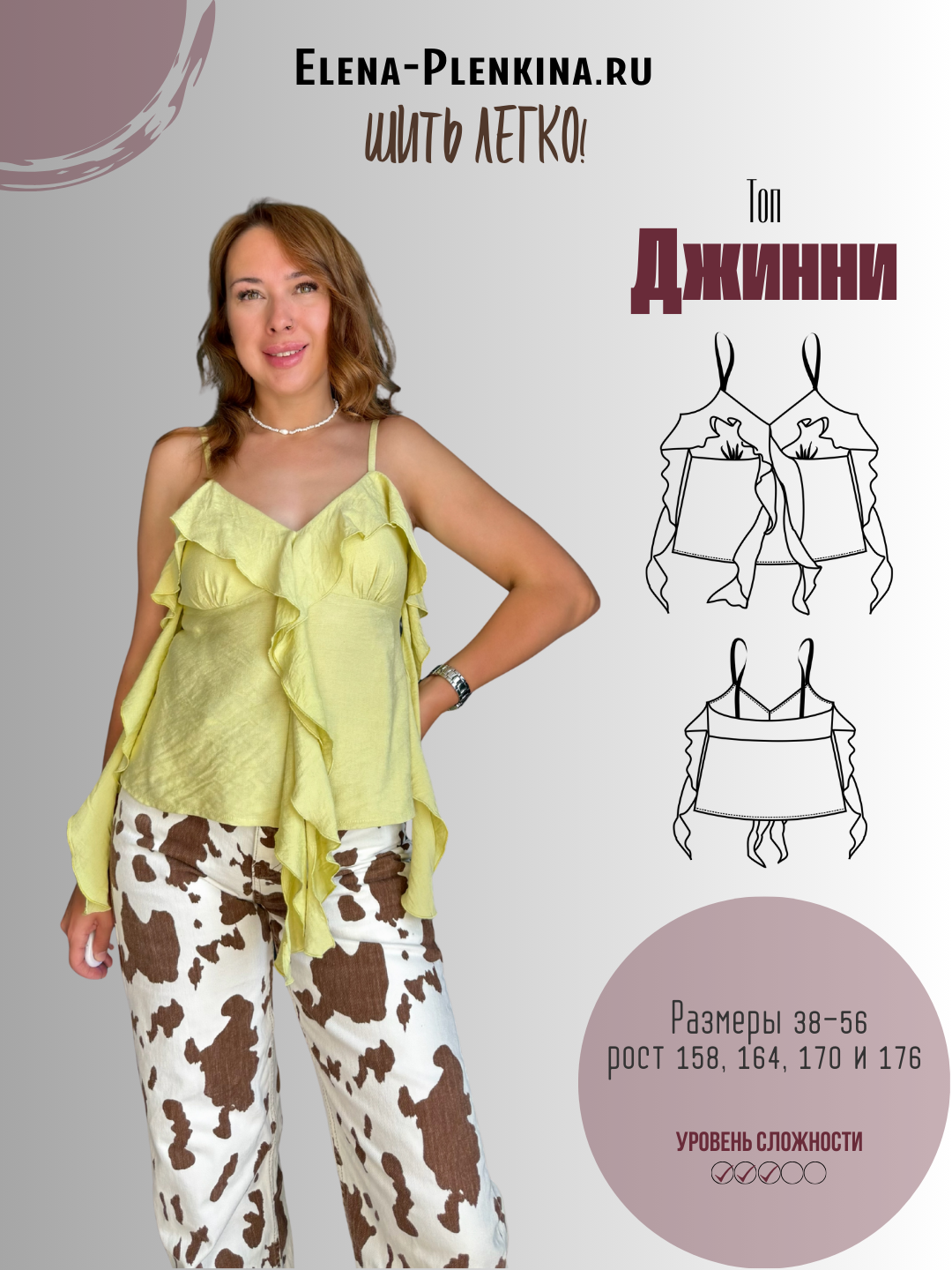 Выкройка представлена в размерах 38-56 на рост 158, 164, 170 и 176 см.