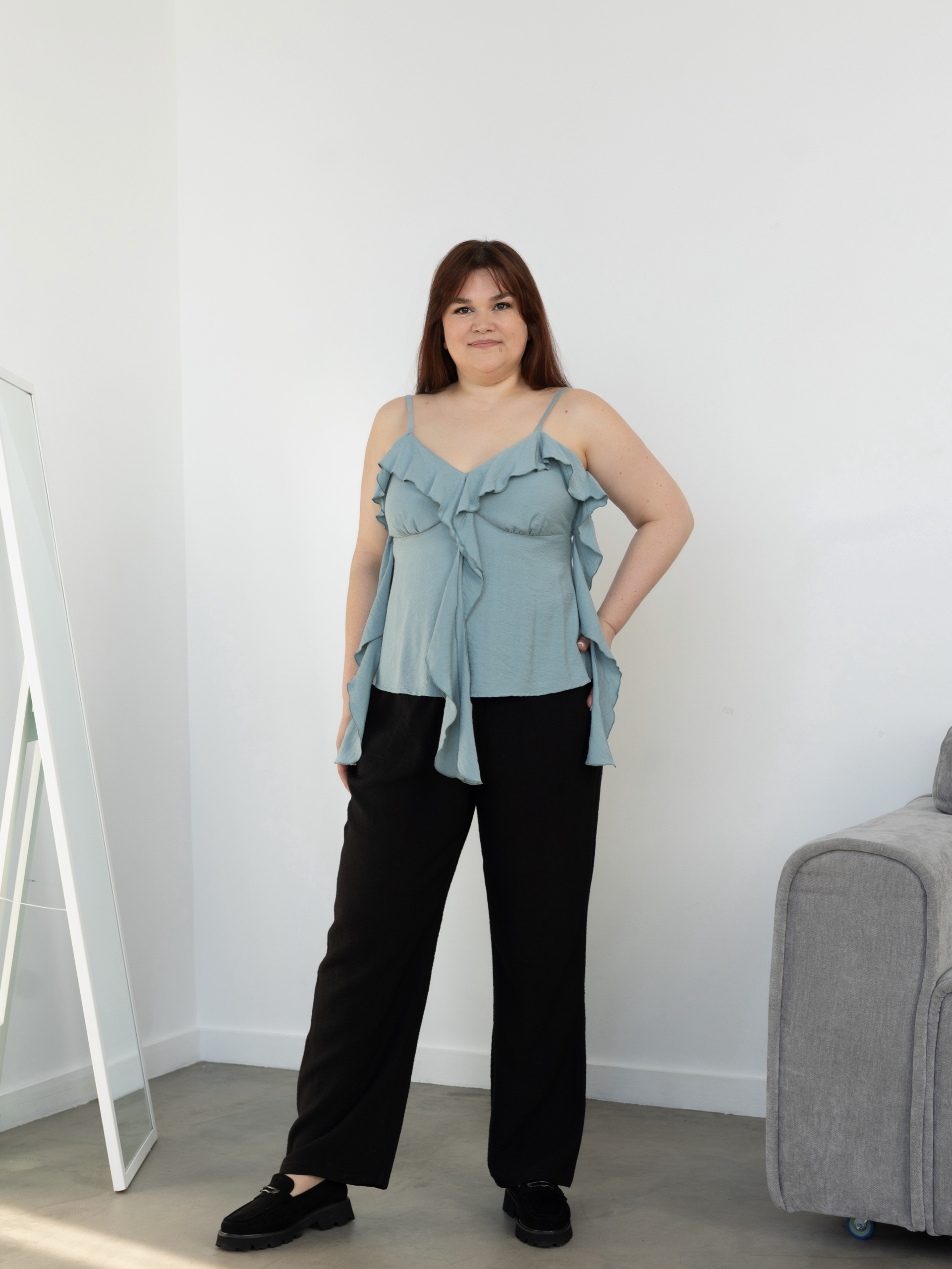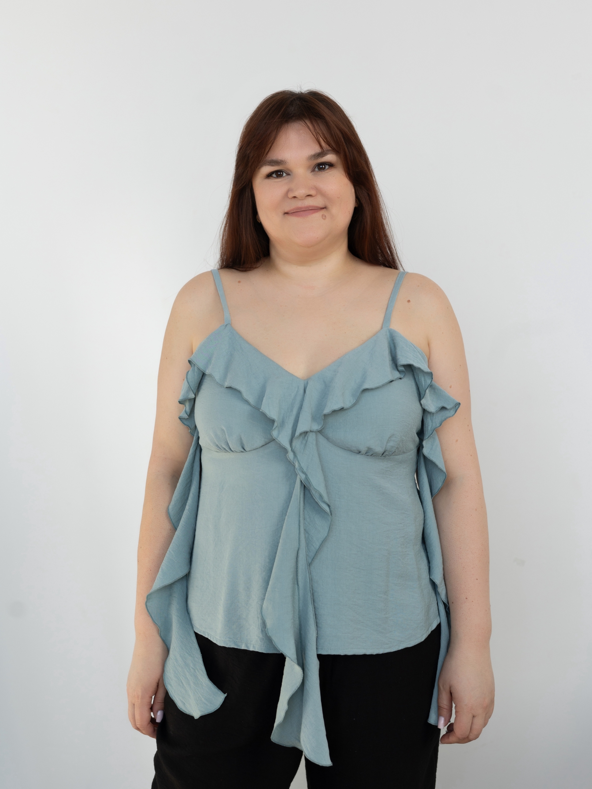 Женский топ умеренного объема, нагрудные вытачки переведены в сборку по низу лифа переда, по вырезу горловины переда втачной волан, переходящий в свободные концы по центру переда и по боковым сторонам, нижняя часть топа трапецивидного силуэта, на тонких бретелях, длина изделия выше линии бедер.