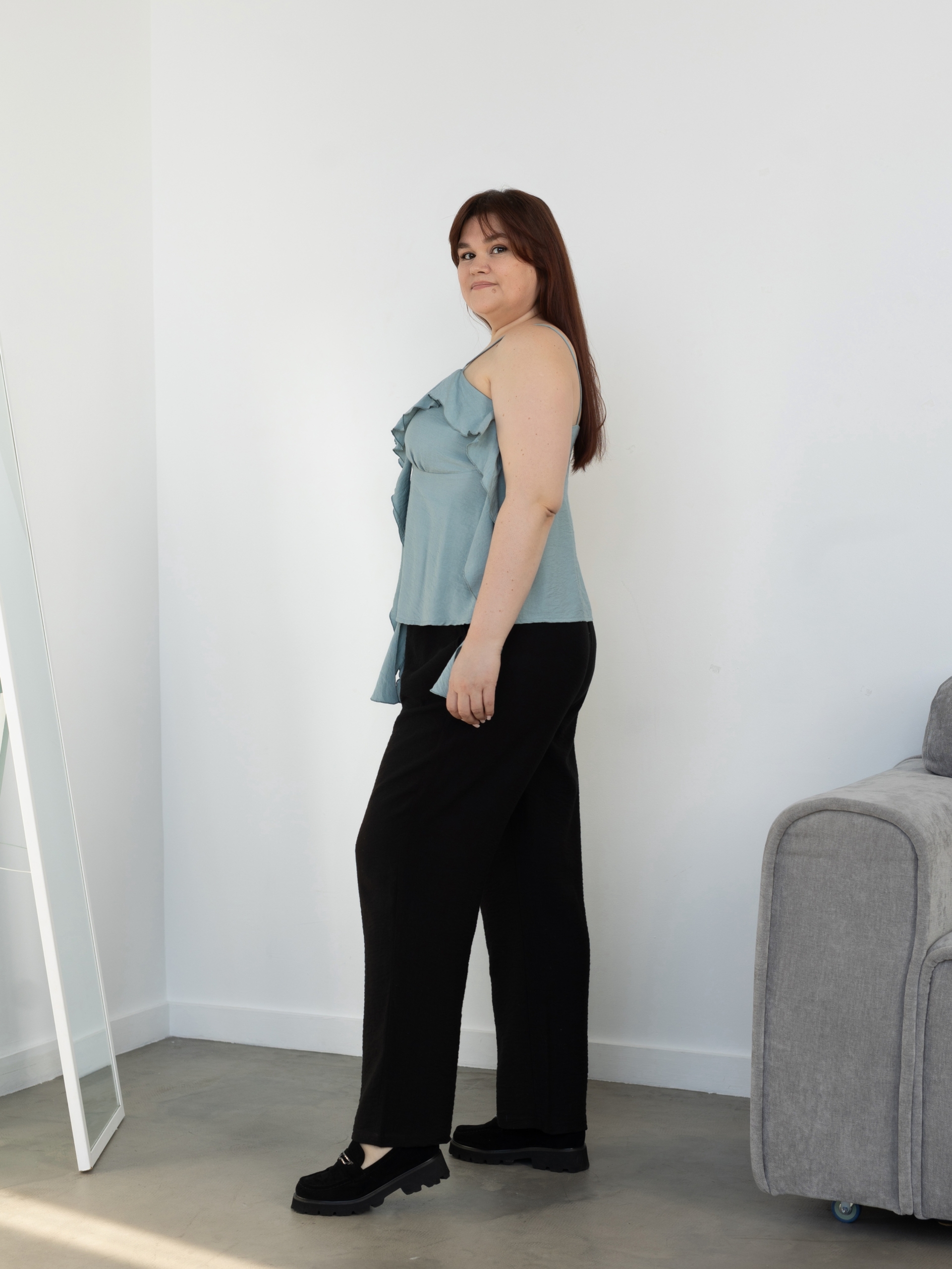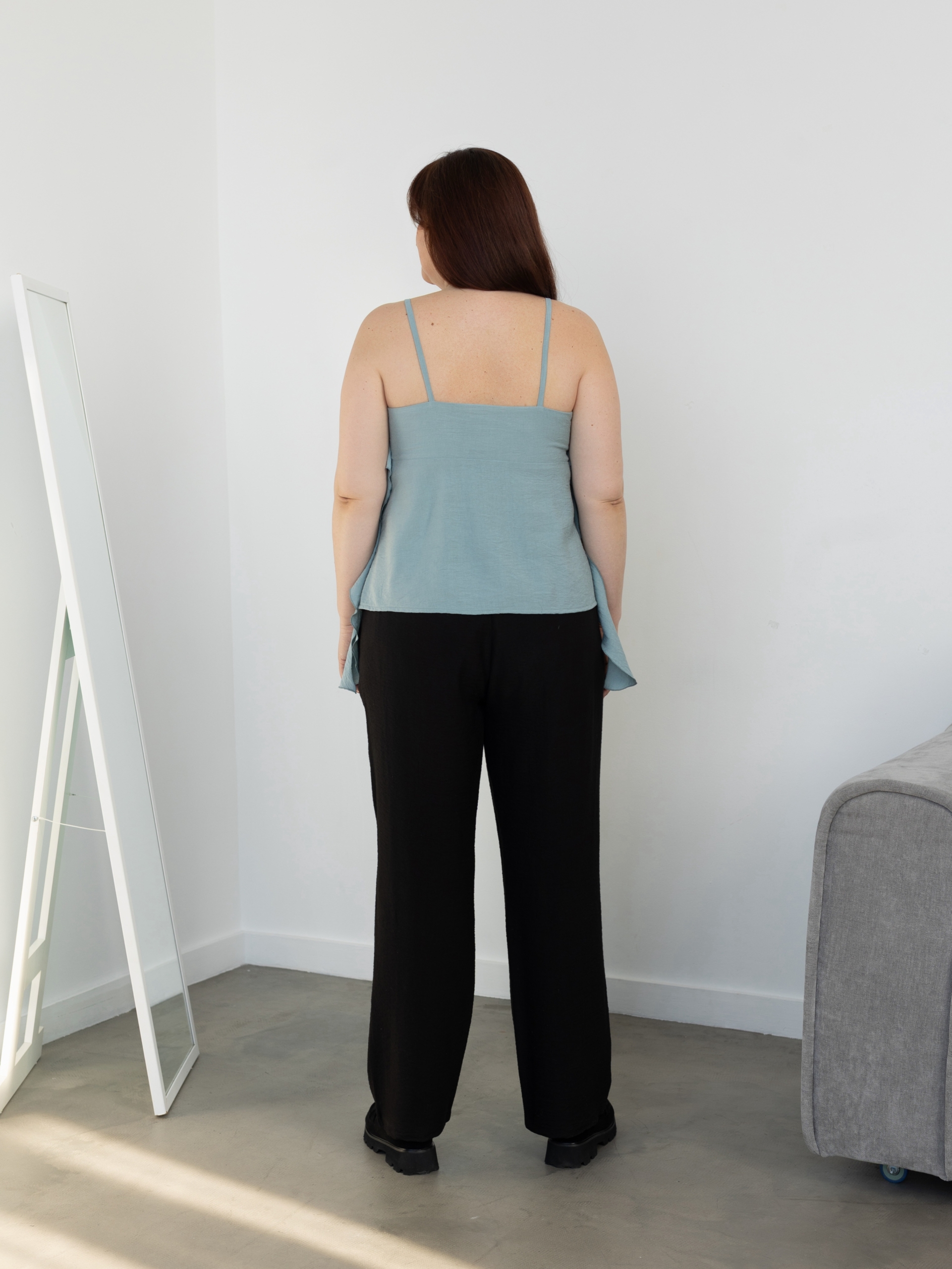 Модель Елена, топ 44 размера рост 170 см, реальный размер (на момент фотосессии) 44 рост 167 см. Параметры тела: ОГ 87 см, ОТ 72 см, ОБ 96 см. Размер выбран по обхвату груди. Сшит из вискозы краш плотностью 130 гр./м2, состав: 80% вискоза, 20% нейлон.