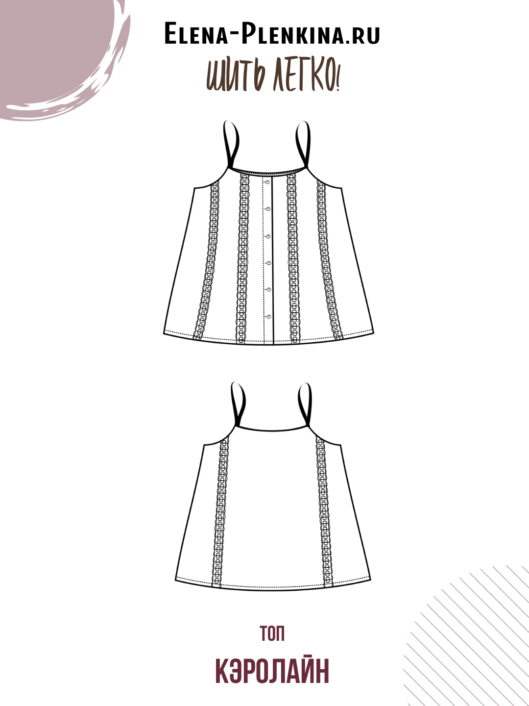 Рекомендуемые материалы – лён 100%, лён с вискозой, вареный хлопок, вискоза плательная, штапель, штапель твил, муслин, креп, креп жатка, креп краш, тенсель, рубашечный тонкий джинс, батист и прочие виды легких мягких тканей. Также вам понадобится косая клеевая нитепрошивная кромка, дублерин, 6 рубашечных пуговиц 10-15 мм. По желанию на топ можно добавить кружево.