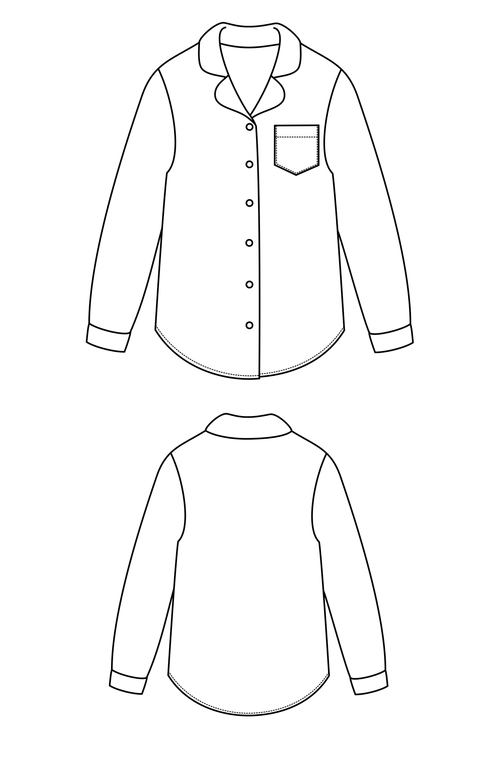 Трикотажная рубашка свободного кроя, прямого силуэта, с отложным воротником с лацканами, втачной рукав с манжетой по низу рукава, низ рубашки фигурный, центральная застежка на рубашечные кнопки, на левой полочке нагрудный карман. По желанию можно добавить кант по краю борта и воротника.
