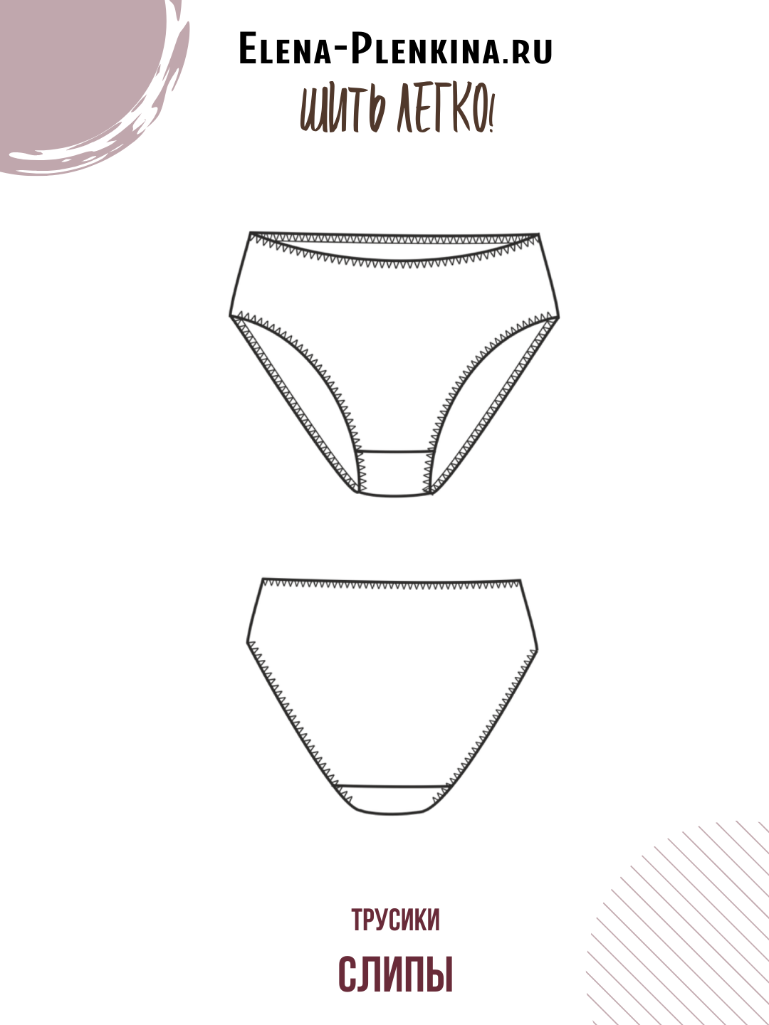 Классические трусики-слипы со средней посадкой, верхний срез и срезы для ножек под обработку ажурной резинкой с фестонами. Для обработки этих срезов окантовочной резинкой, припуски на швы с них необходимо срезать.