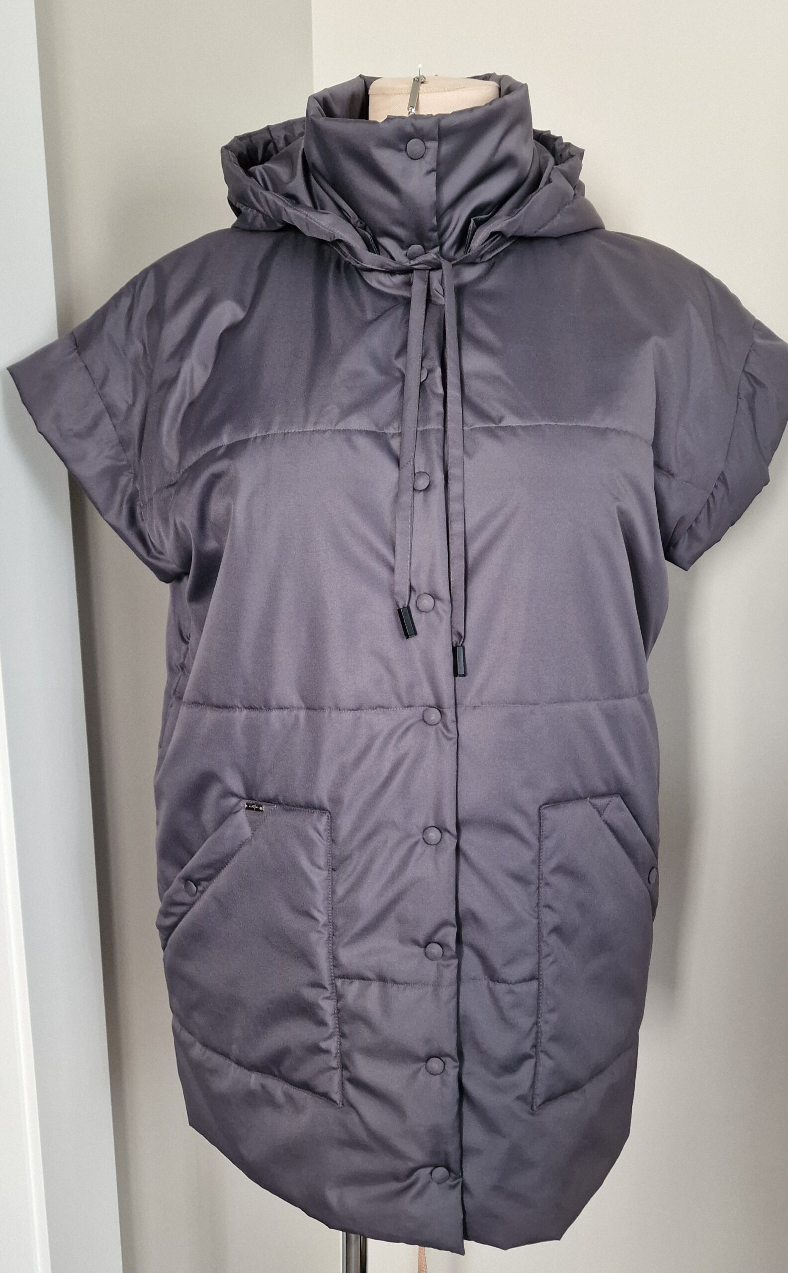 Утепленный жилет свободного кроя, прямого силуэта, на подкладке и утеплителе, спущенное плечо, пройма обработана рукавом-манжетой, центральная застежка на кнопки, на полочках нижние накладные карманы, горловина обработана воротником стойкой, съемный двухшовный капюшон на кнопках, по желанию можно добавить пояс (длина и ширина детали пояса указаны в таблице ниже).