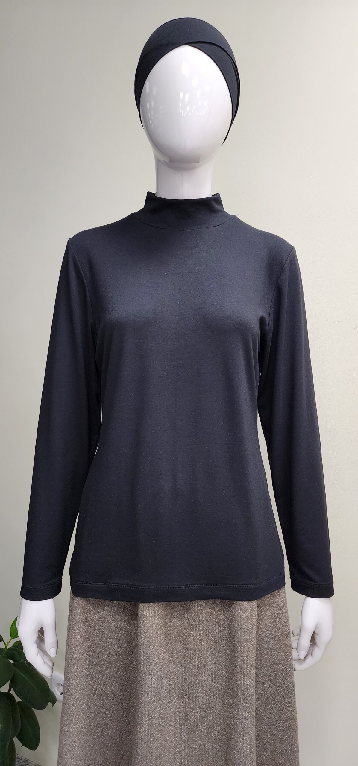 Трикотажная водолазка полуприлегающего силуэта, длинный тачной рукав, воротник стойка, низ рукава и низ изделия с подгибкой под распошивальный шов.