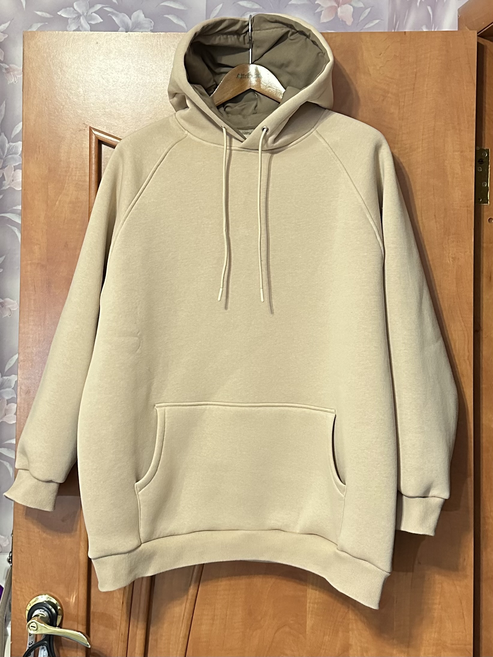 Модель Елена, худи 44 размера рост 170 см, реальный размер (на момент фотосессии) 44 рост 167 см. Параметры тела: ОГ 88, ОТ 72, ОБ 96, размер выбран по обхвату груди. Футер 3-х нитка с начесом, на отделке кашкорсе, подкладка капюшона – кулирка с лайкрой.