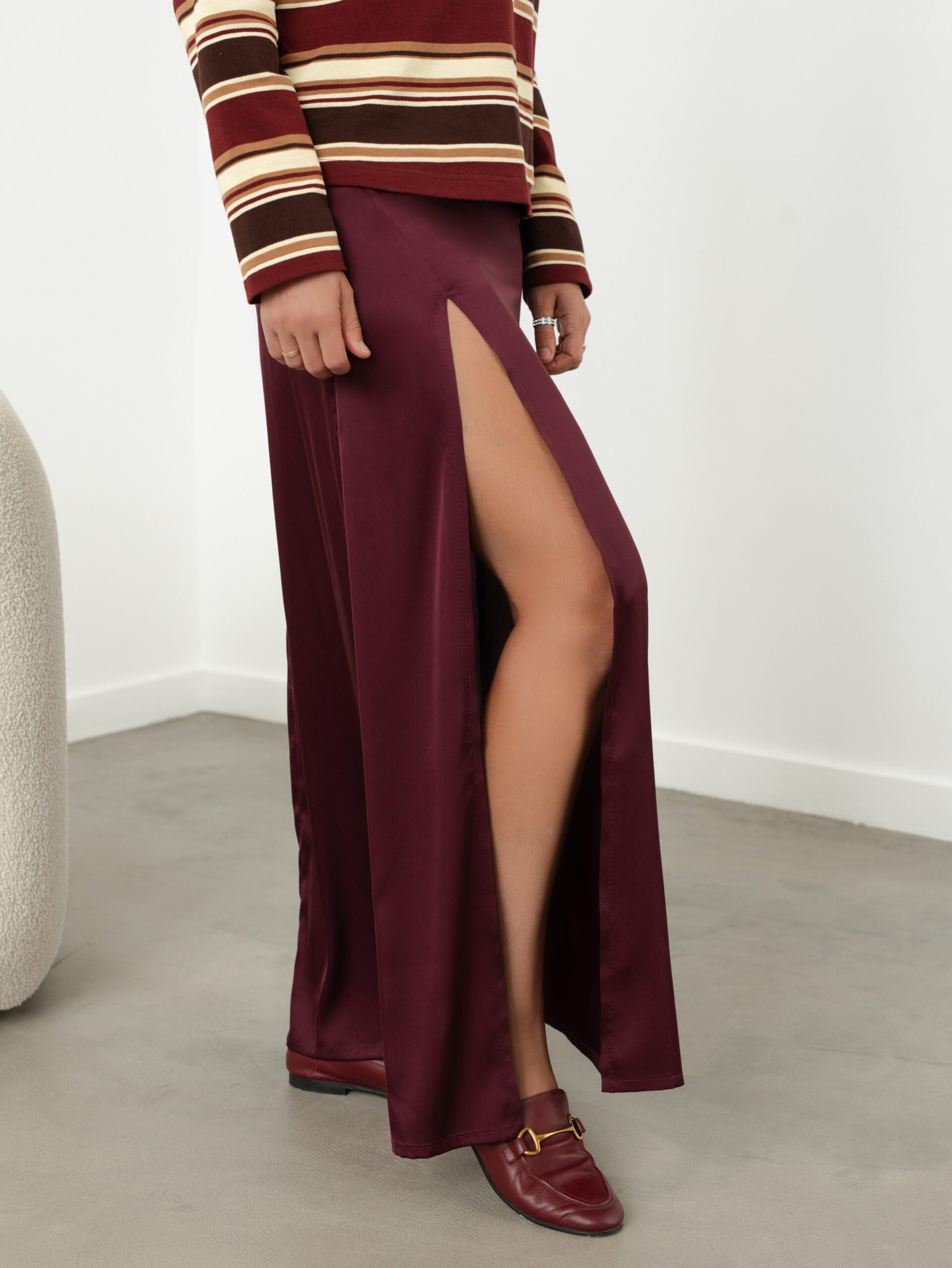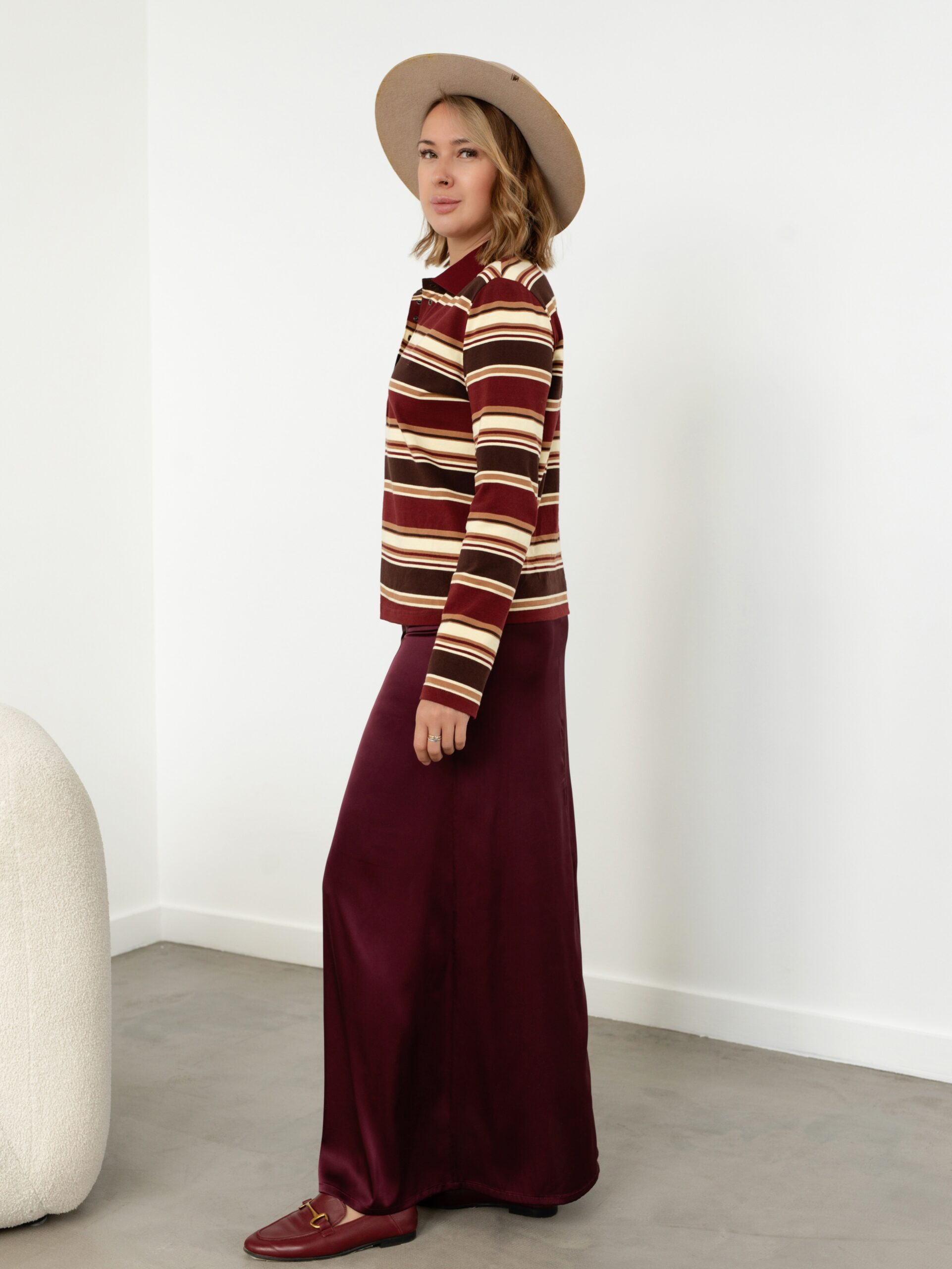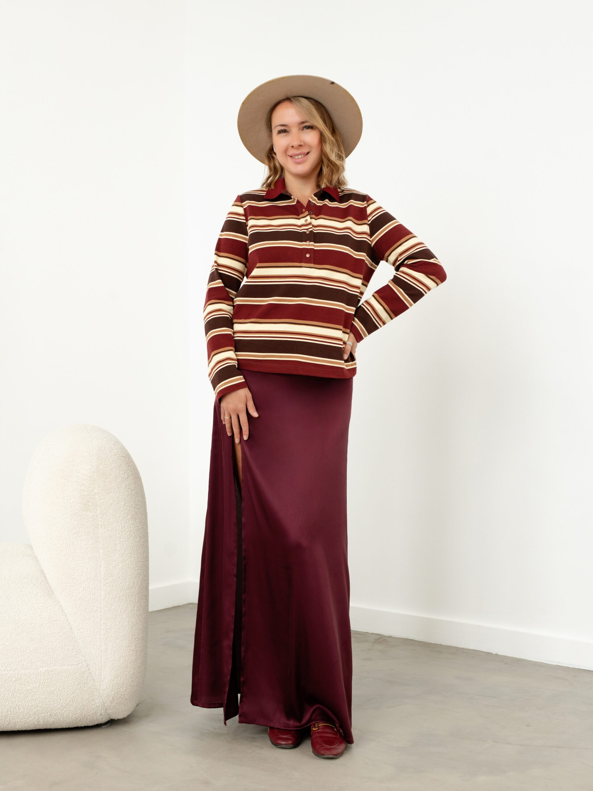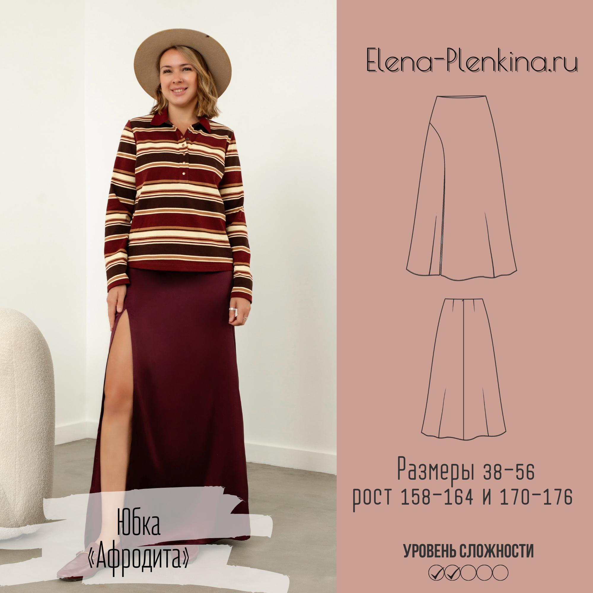 Модель Елена, юбка 44 размера рост 170 см, реальный размер (на момент фотосессии) 44 рост 167 см. Параметры тела: ОГ 88 см, ОТ 74 см, ОБ 98 см. Размер выбран по обхвату бедер. Сшита из искусственного шелка «Армани» плотностью 90 гр/м2, состав: полиэстер 97%, спандекс 3%. Также на Елене лонгслив-поло по выкройке «Лаура».