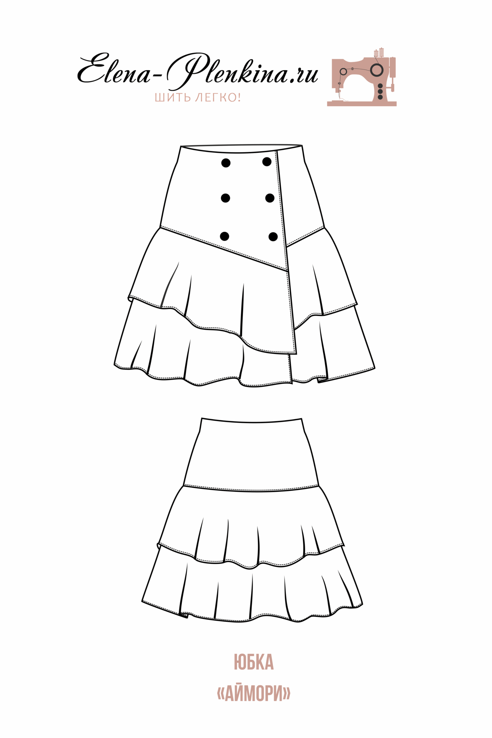 Женская юбка на запах, умеренного объема, нижняя часть покроя солнце, с кокеткой, кокета переда ассиметричного кроя, между кокеткой и юбкой втачан волан, застежка по переду на 6 пуговиц на ножке, длина юбки в 38 размере до середины бедра и увеличивается с каждым размером.