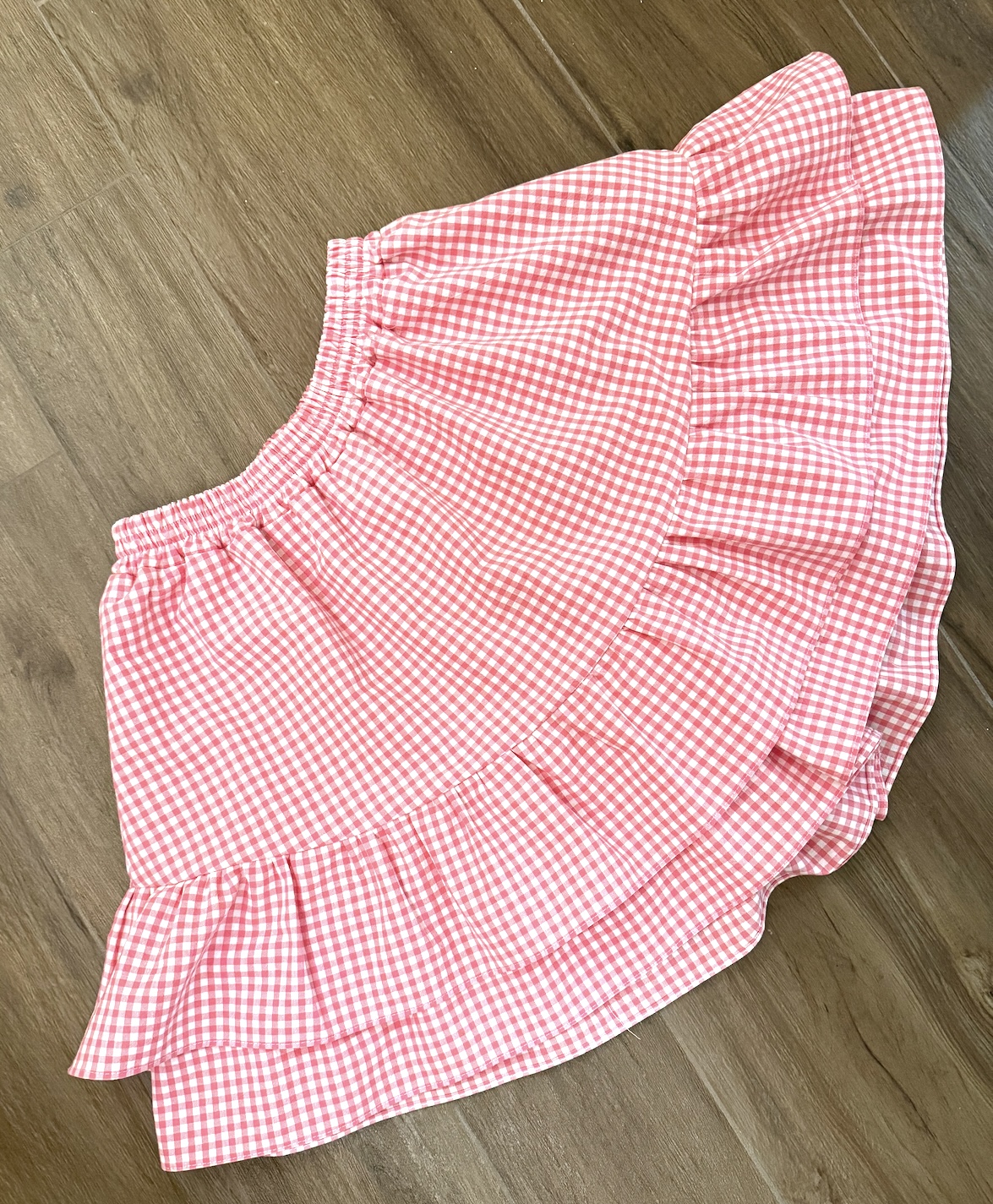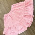 Женская юбка широкого кроя, по низу юбки широкая оборка, подкладка в виде шорт, по нижнему срезу шорт широкая оборка, верх оформлен притачным поясом из основной ткани, внутри пояса широкая резинка, длина юбки мини.