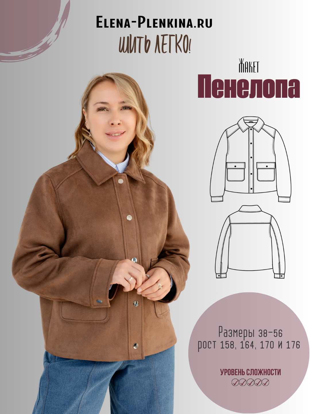 Выкройка представлена в размерах 38-56 на рост 158, 164, 170 и 176 см.