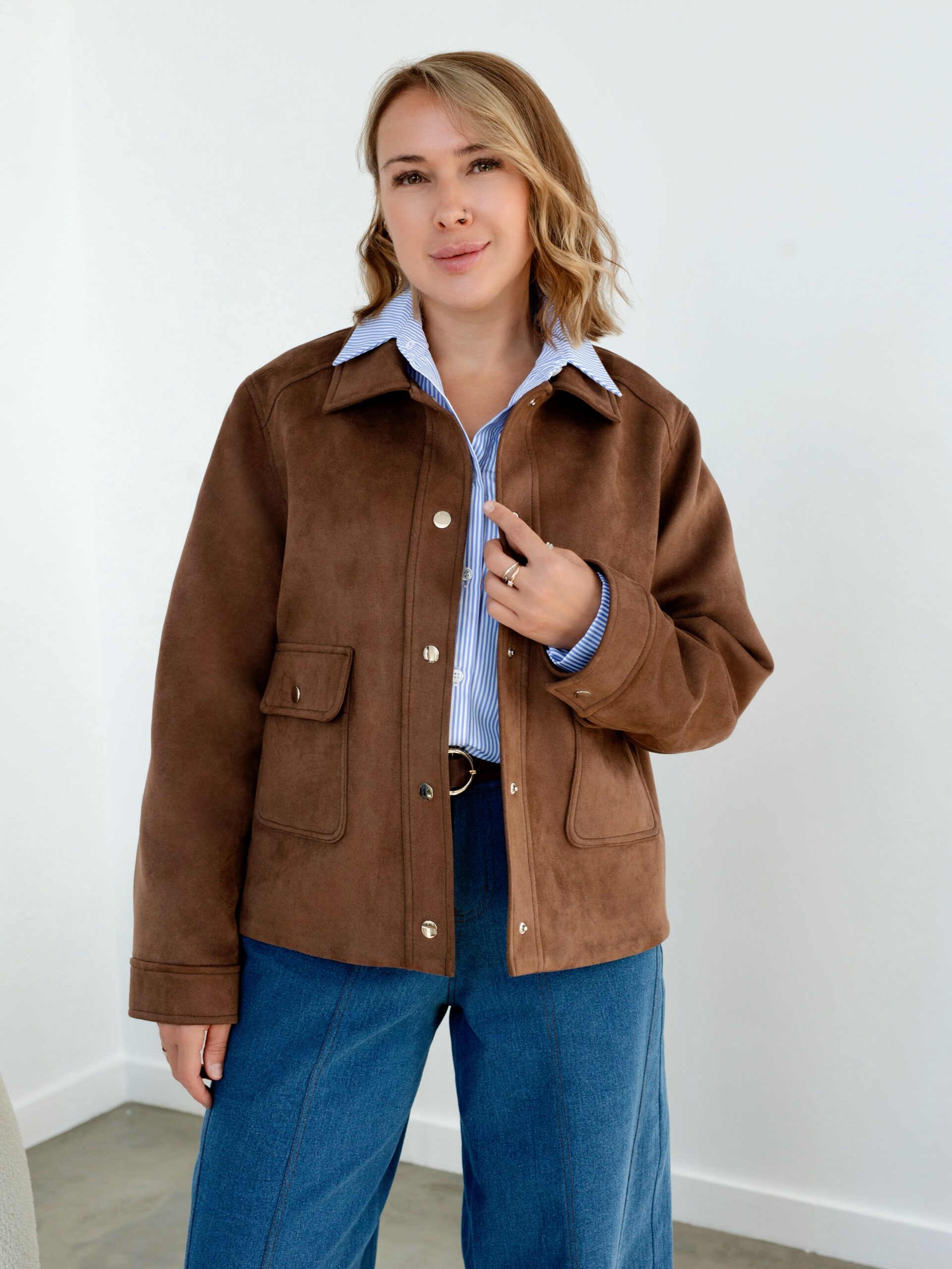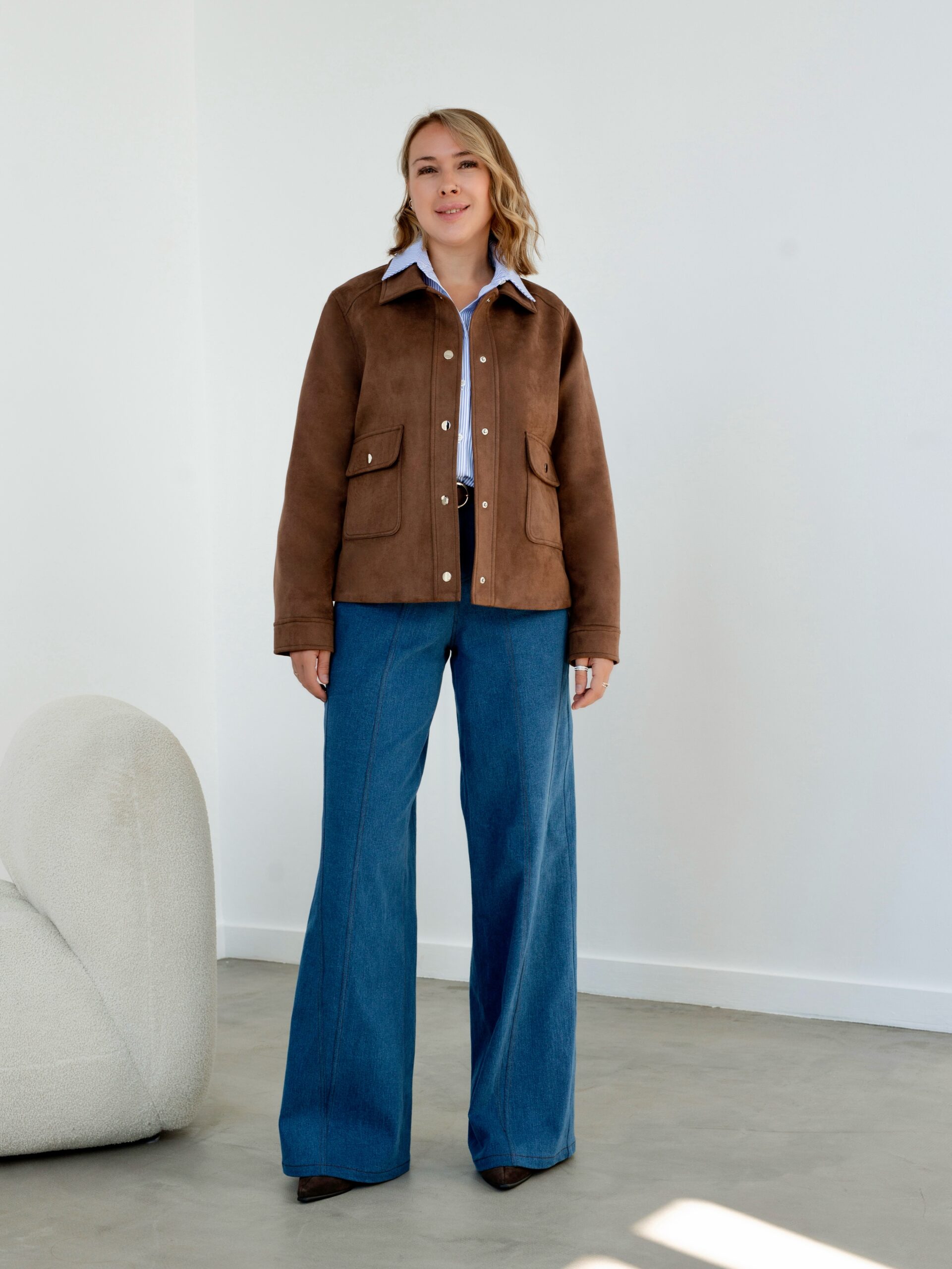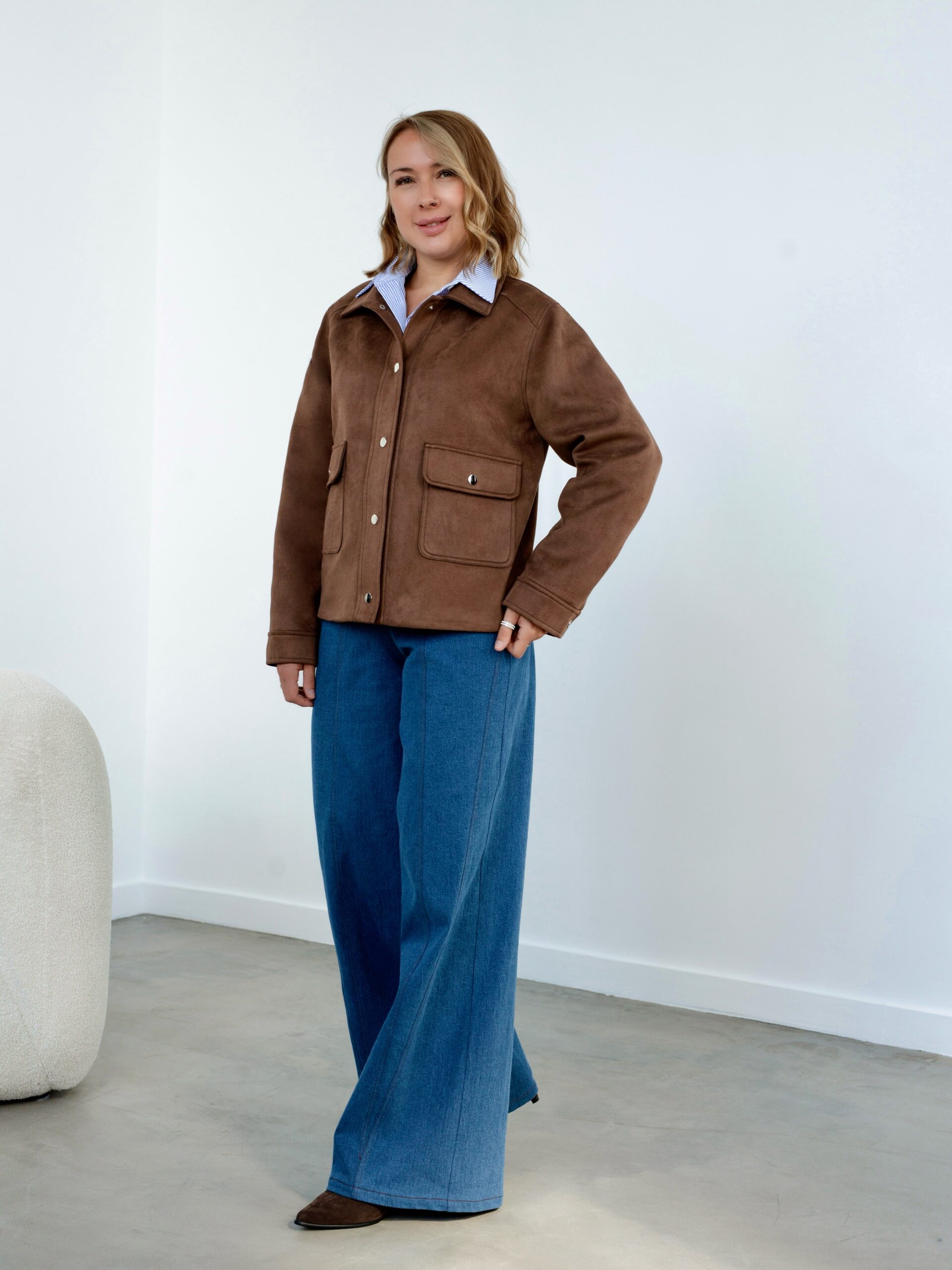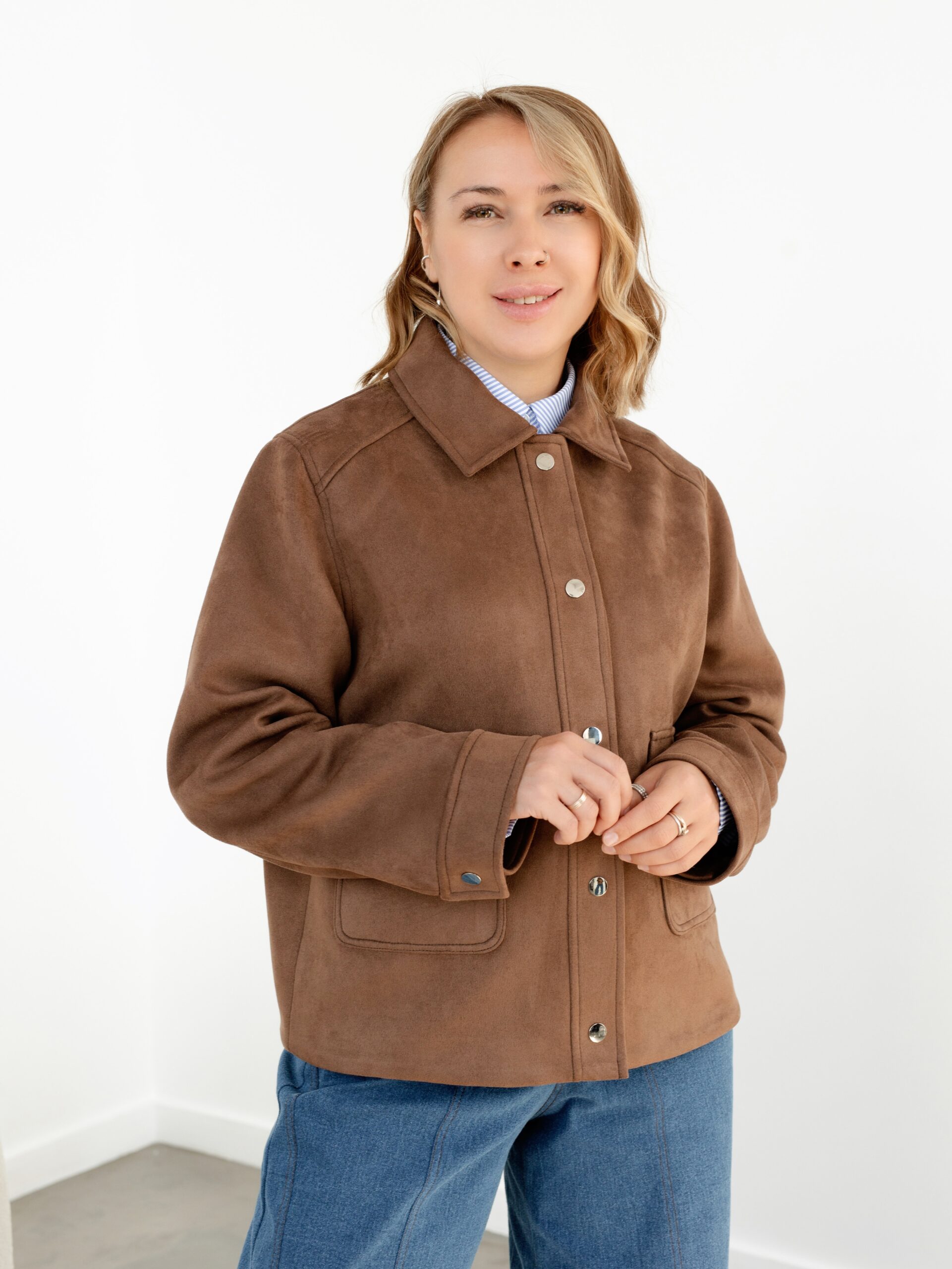 Модель Елена, жакет 44 размера рост 170 см, реальный размер (на момент фотосессии) 44 рост 167 см. Параметры тела: ОГ 88 см, ОТ 74 см, ОБ 98 см. Размер выбран по обхвату груди. Сшит из искусственной замши плотностью 420 гр., состав: 95% пэ, 5% эластан, все детали продублированы дублерином плотностью 62 гр. На подкладке вискозная подкладочная ткань. Также на Елене джинсы по выкройке “Имоджен”.
