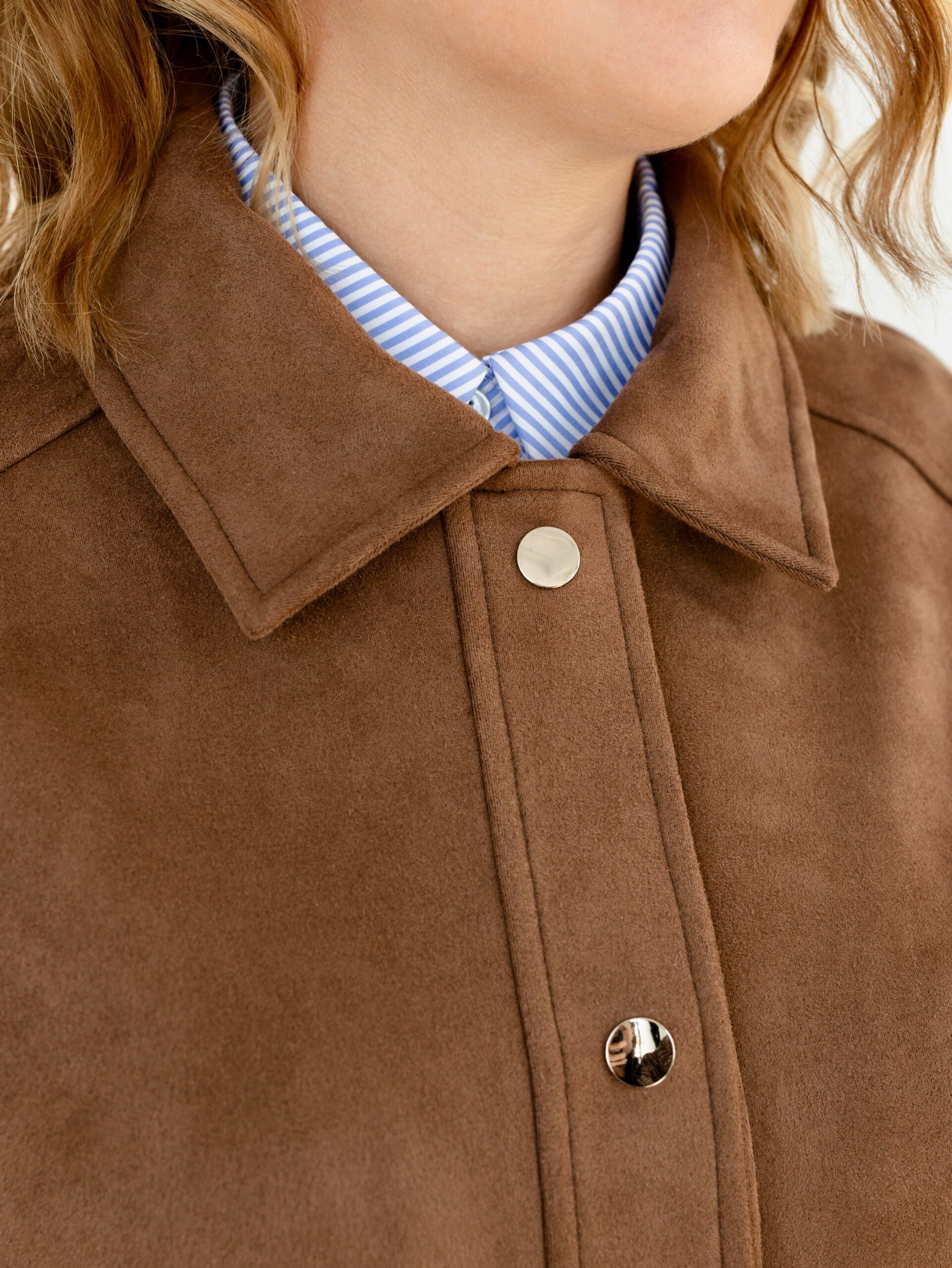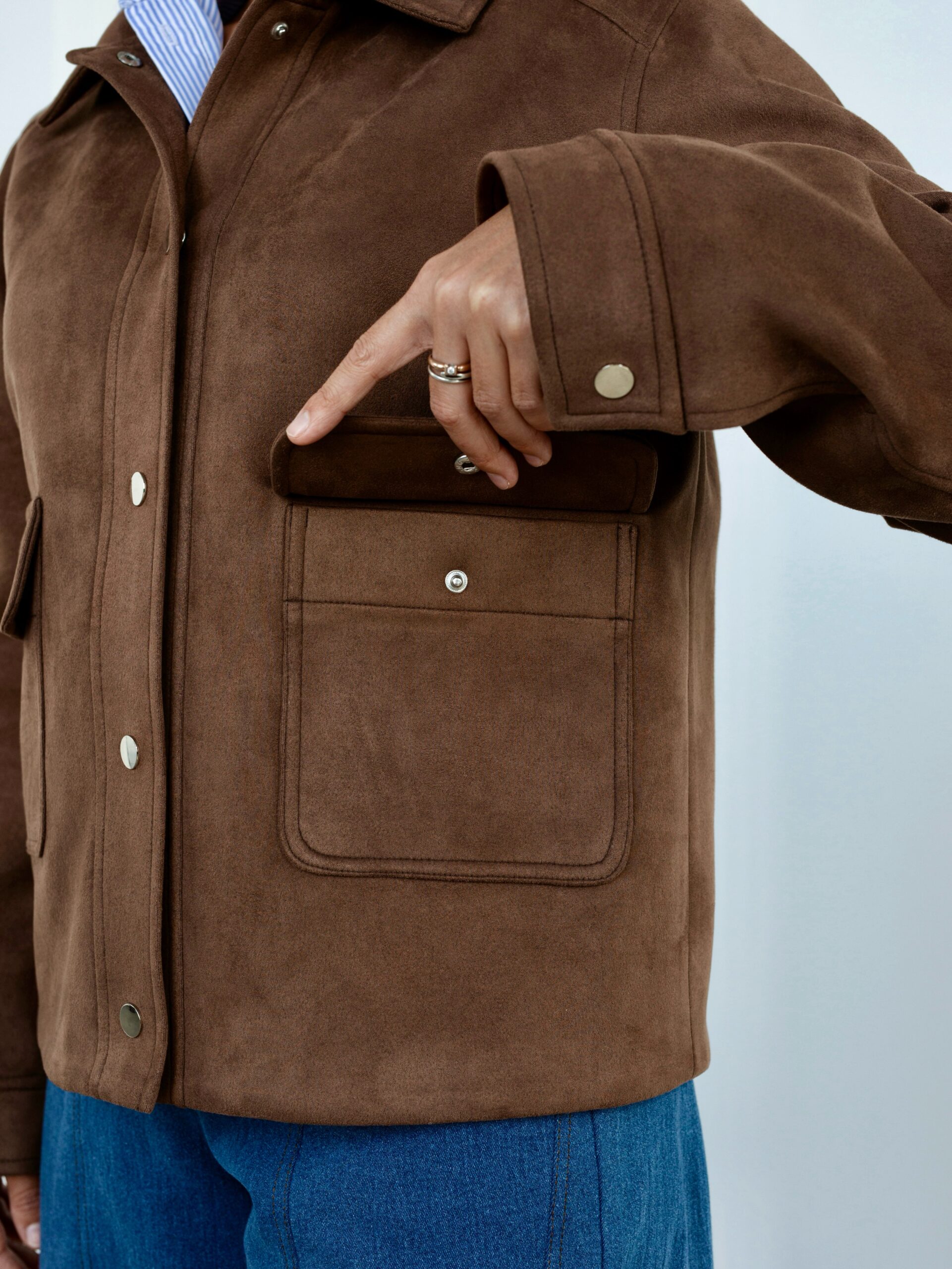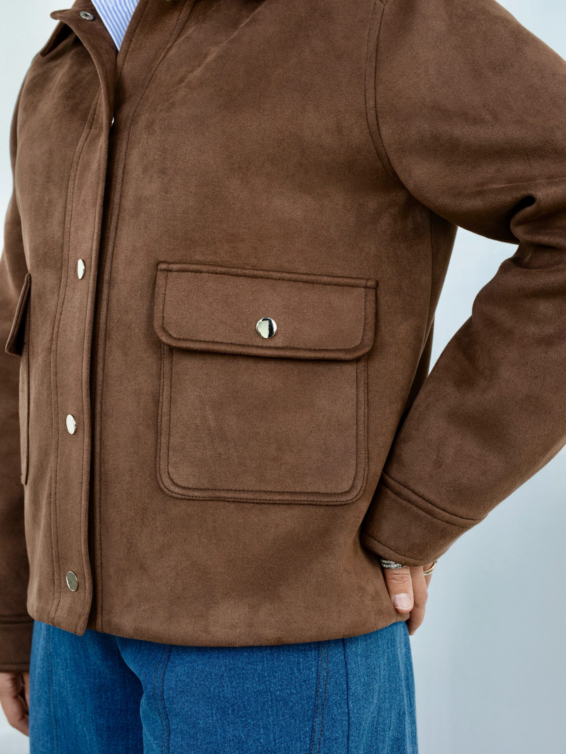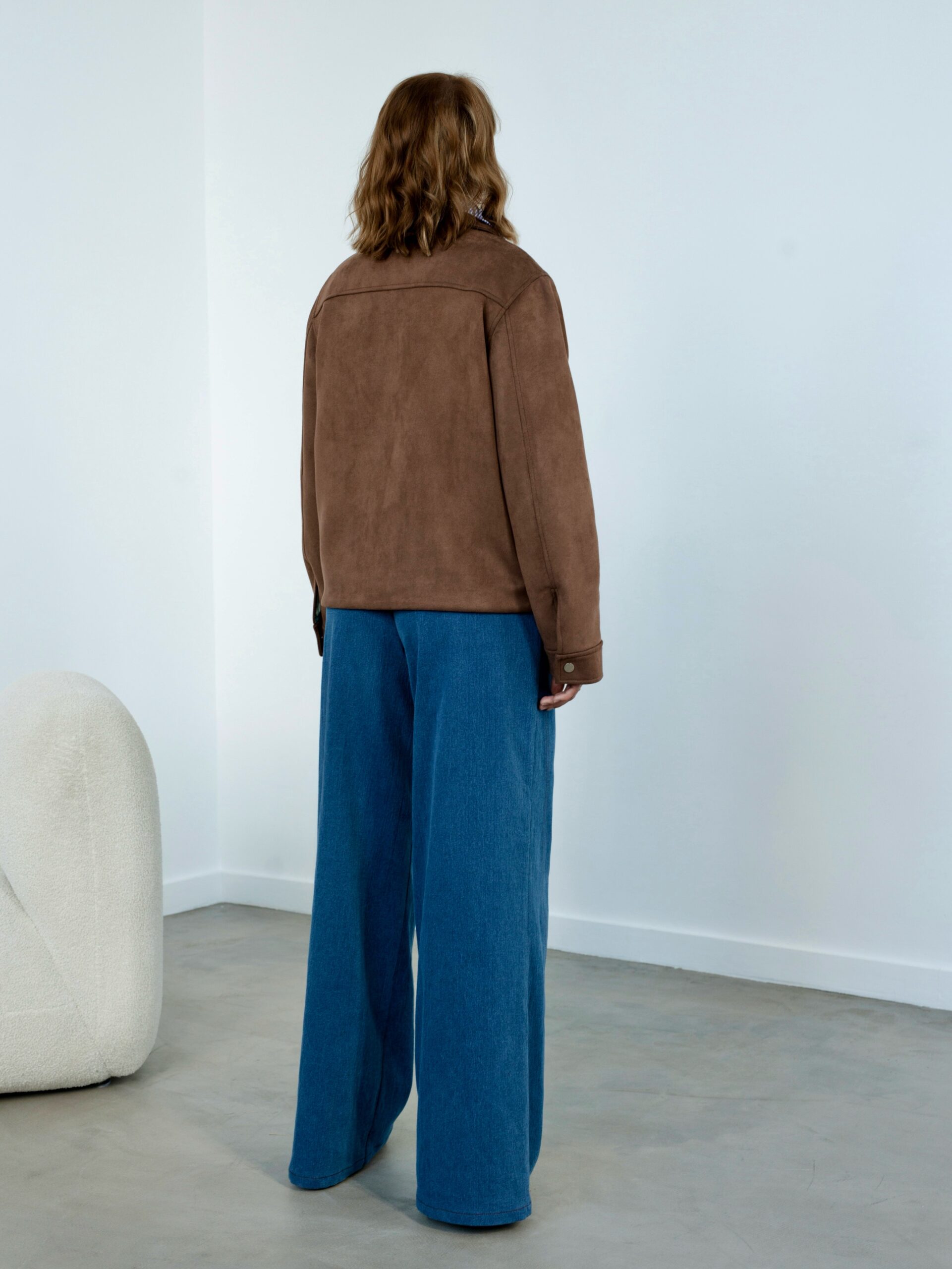 Модель Елена, жакет 44 размера рост 170 см, реальный размер (на момент фотосессии) 44 рост 167 см. Параметры тела: ОГ 88 см, ОТ 74 см, ОБ 98 см. Размер выбран по обхвату груди. Сшит из искусственной замши плотностью 420 гр., состав: 95% пэ, 5% эластан, все детали продублированы дублерином плотностью 62 гр. На подкладке вискозная подкладочная ткань. Также на Елене джинсы по выкройке “Имоджен”.