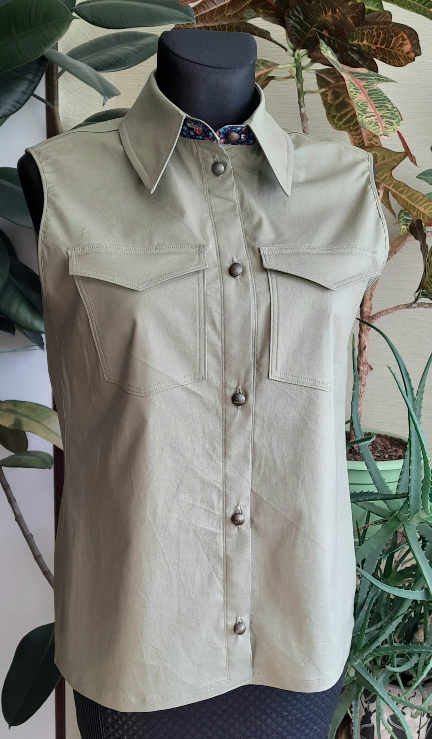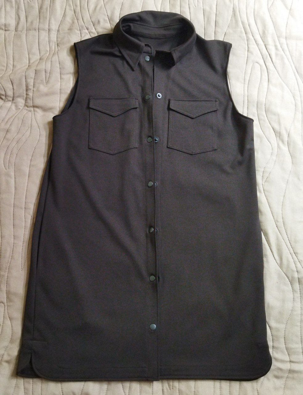 Шила жилет по выкройке 46 размера из ткани поплин-стрейч. Укоротила низ изделия, так как хотелось покороче изделие, что бы можно было носить и как жилет, и как блузу.