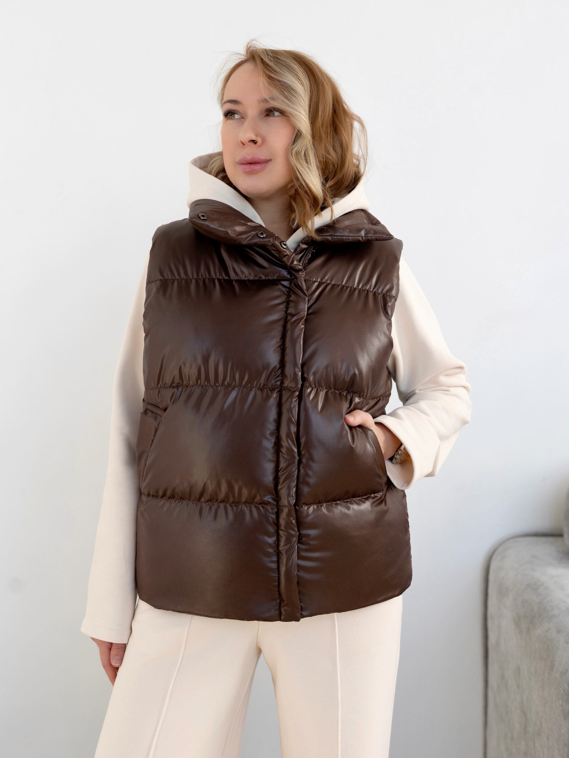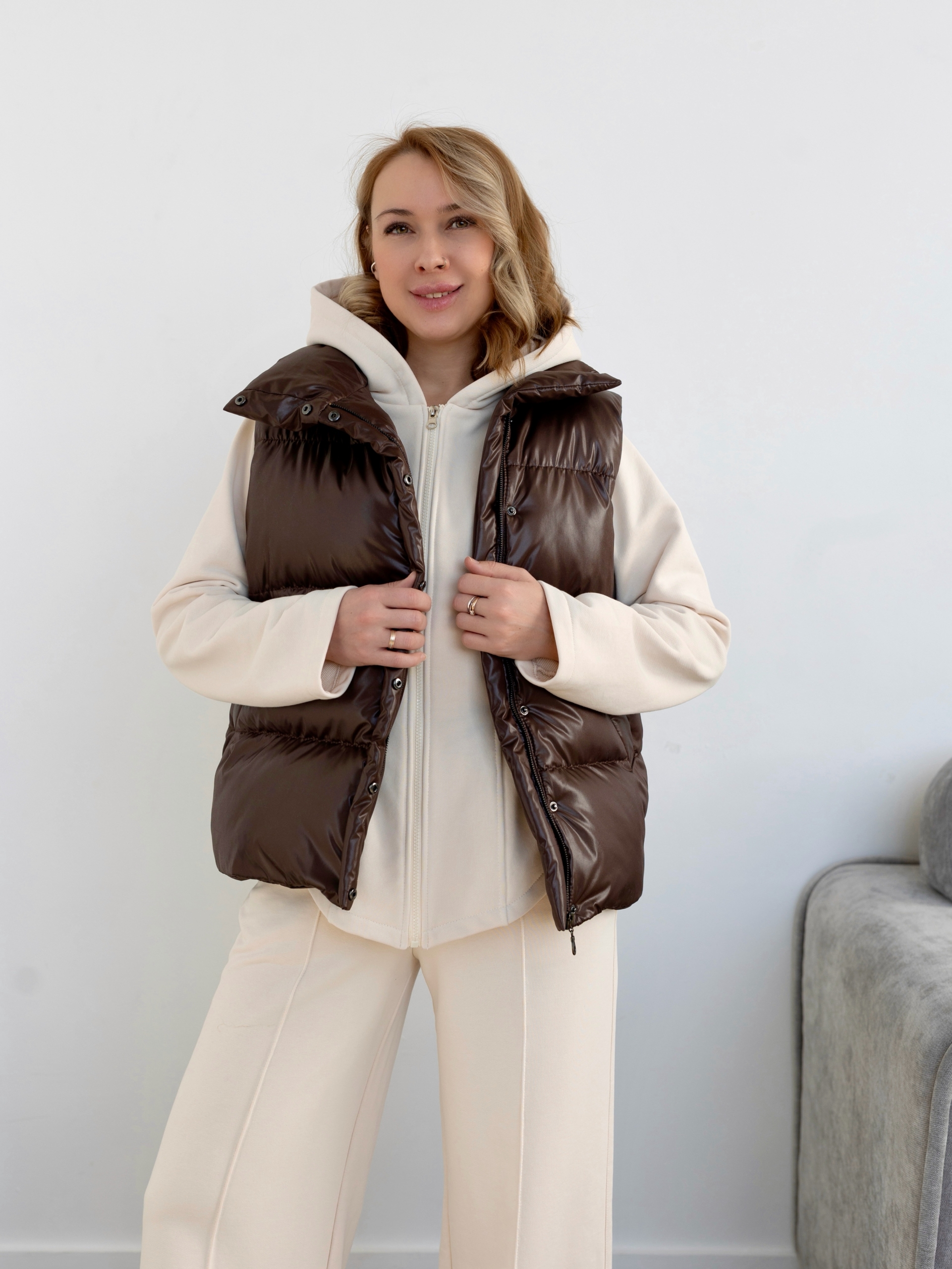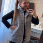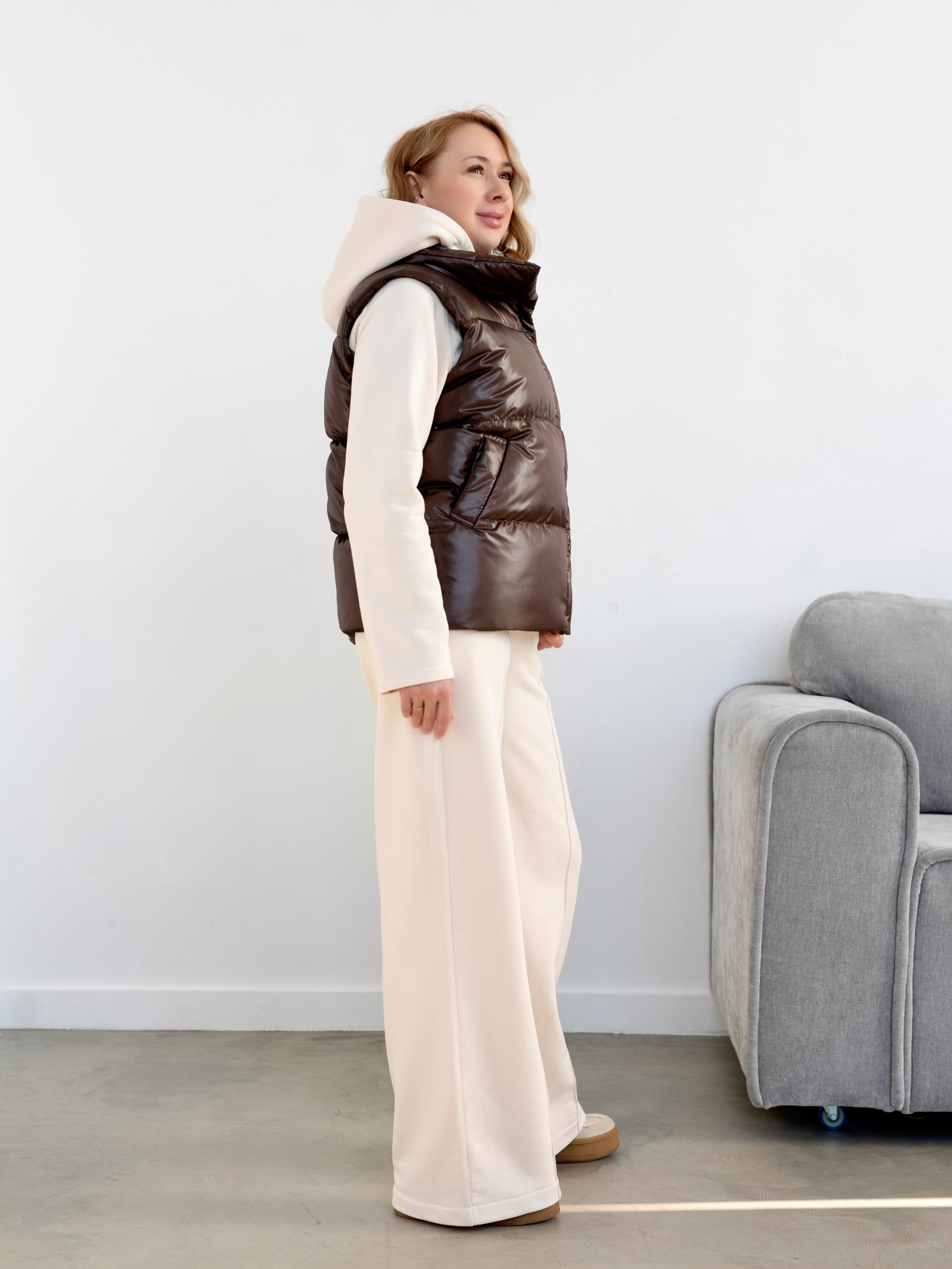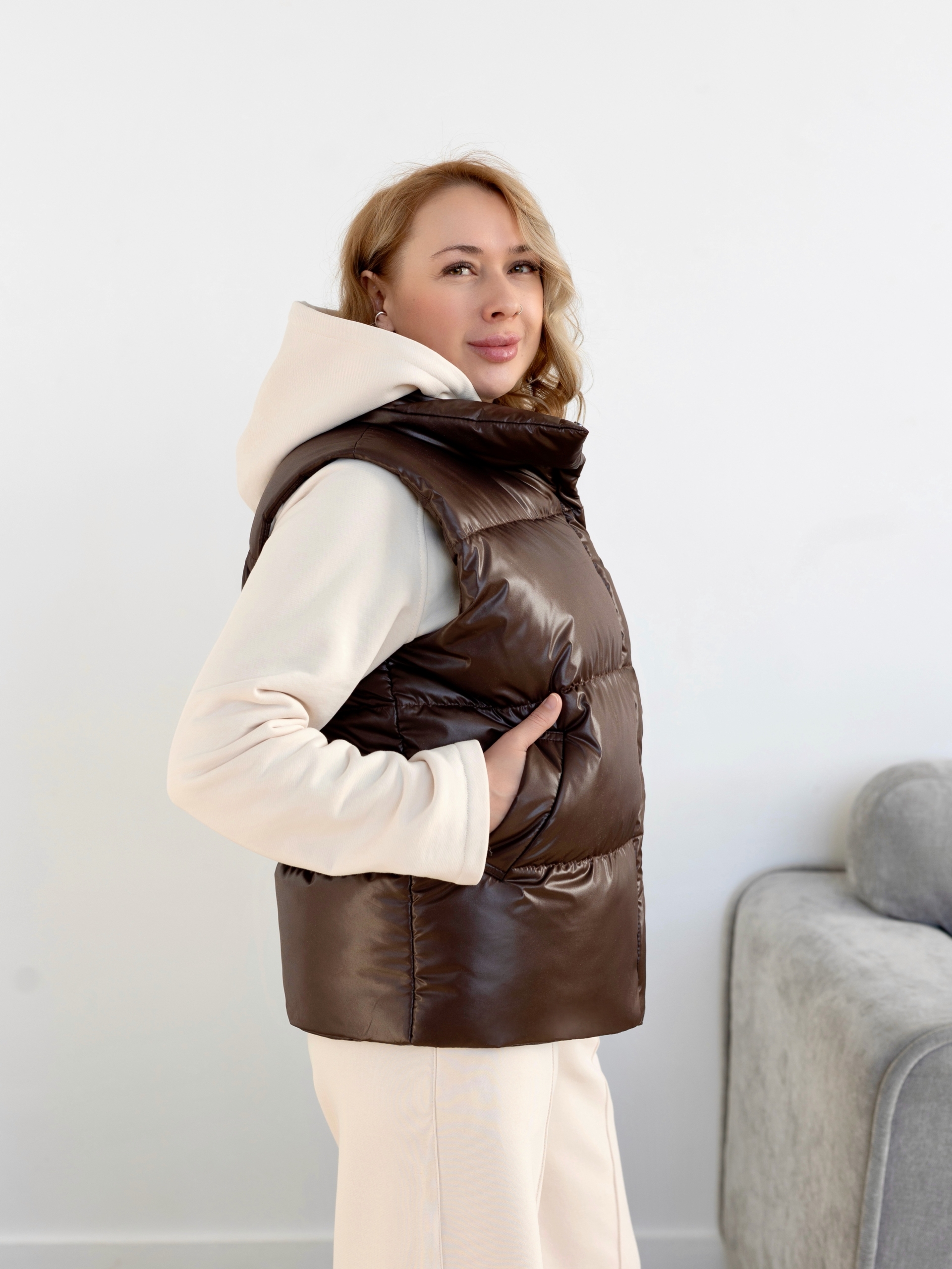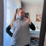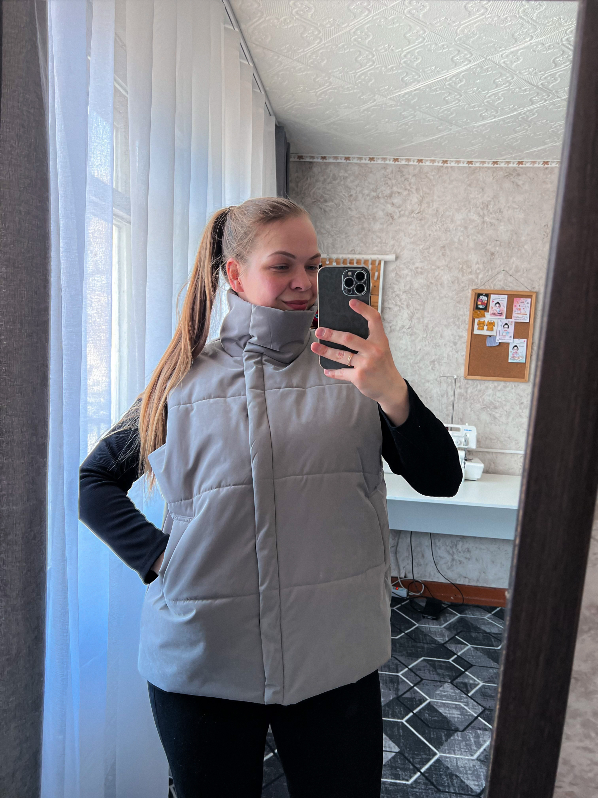Модель Елена, жилет 44 размера рост 170 см, реальный размер (на момент фотосессии) по обхвату груди 44 рост 167 см. Параметры тела: ОГ 87 см, ОТ 72 см, ОБ 96 см. Размер выбран 44 по обхват груди. Ткань верха — курточная ткань дюспо с блеском, утеплитель — слайтекс 100 гр + лебяжий искусственный пух, на подкладке поливискозная подкладочная ткань. Также на Елене свитер по выкройке свитшота «Эрин», джинсы по выкройке «Донна», толстовка по выкройке «Аника» и брюки по выкройке «Лавиния».
