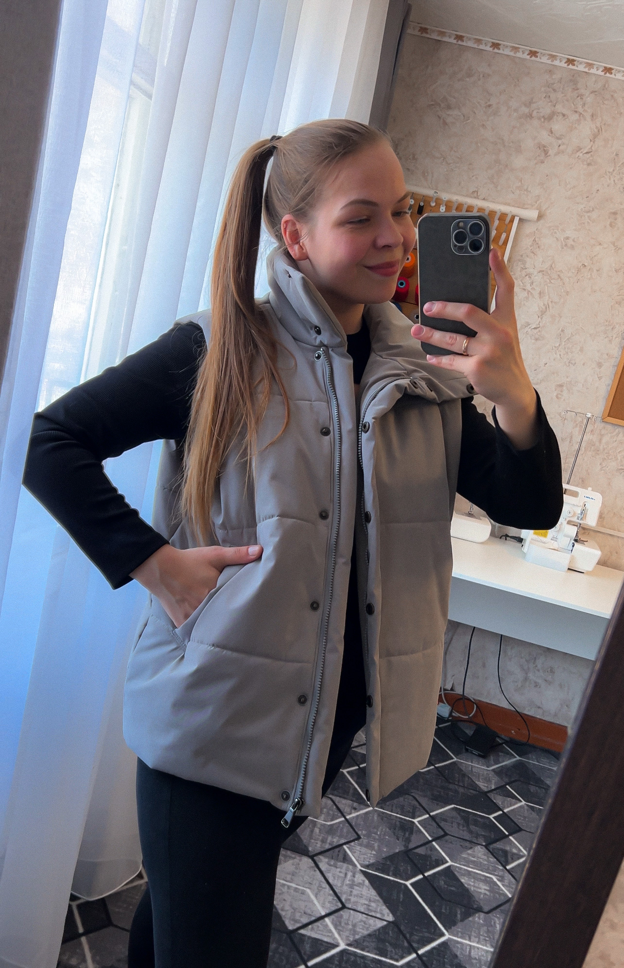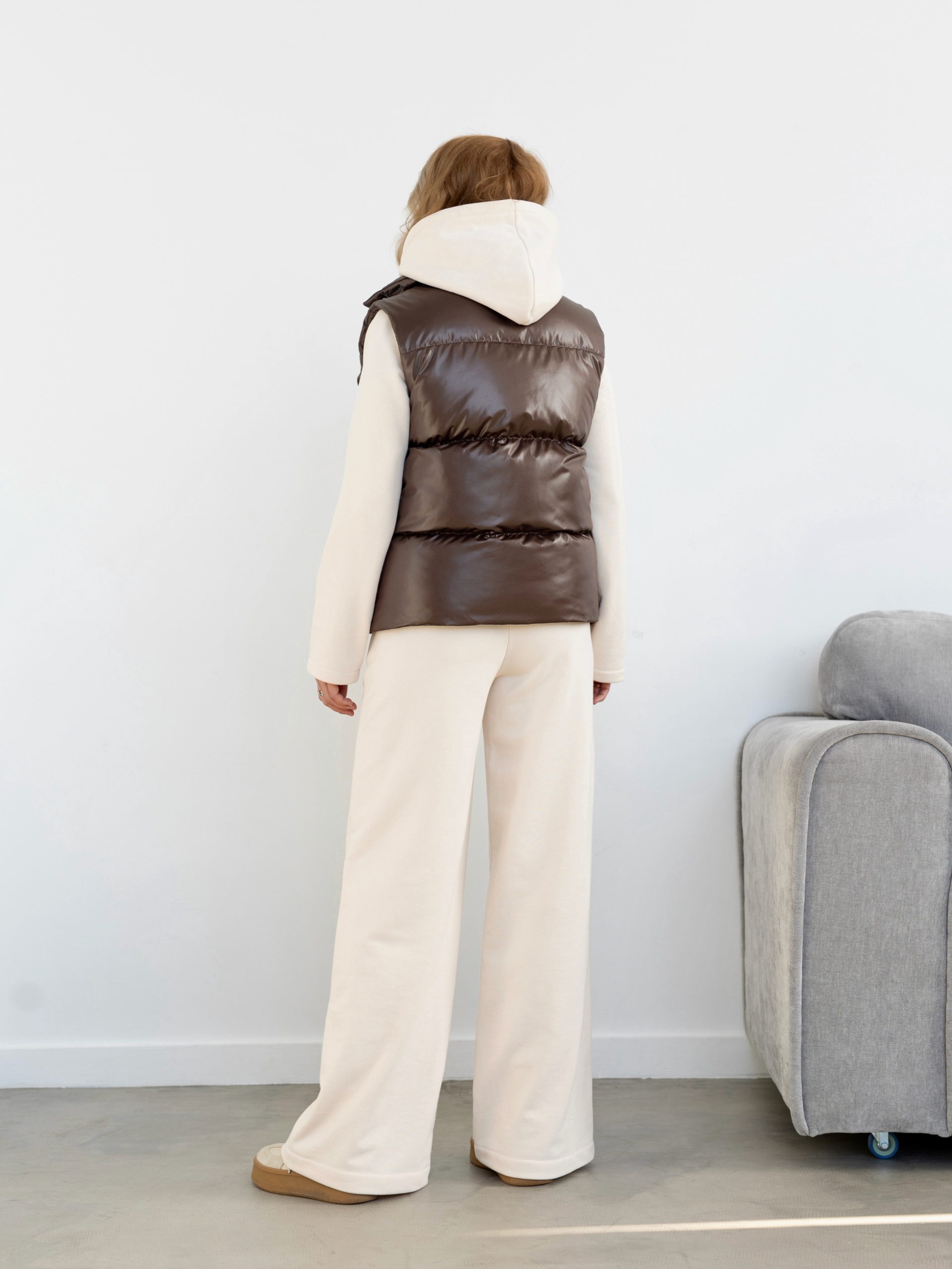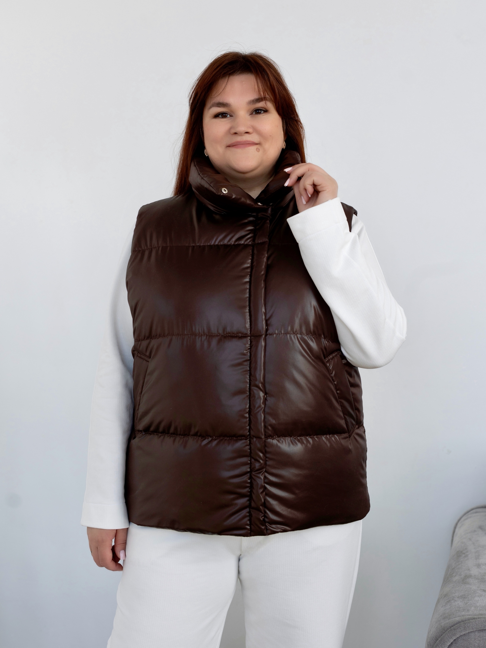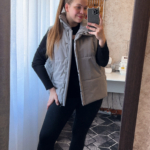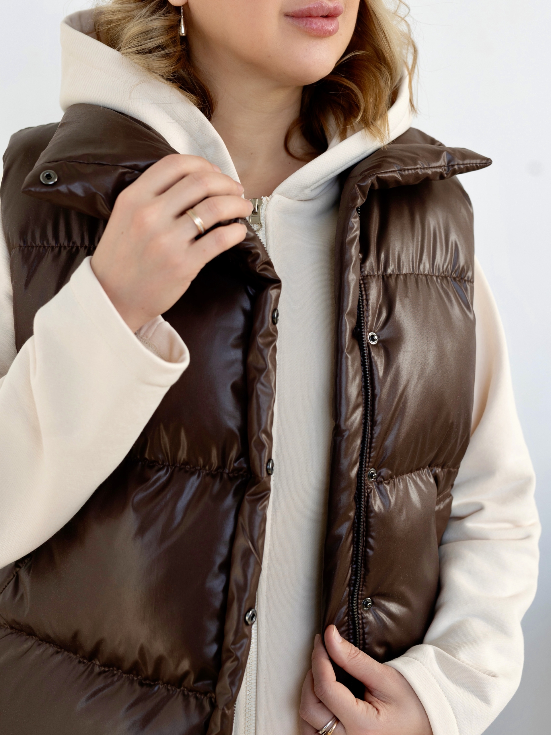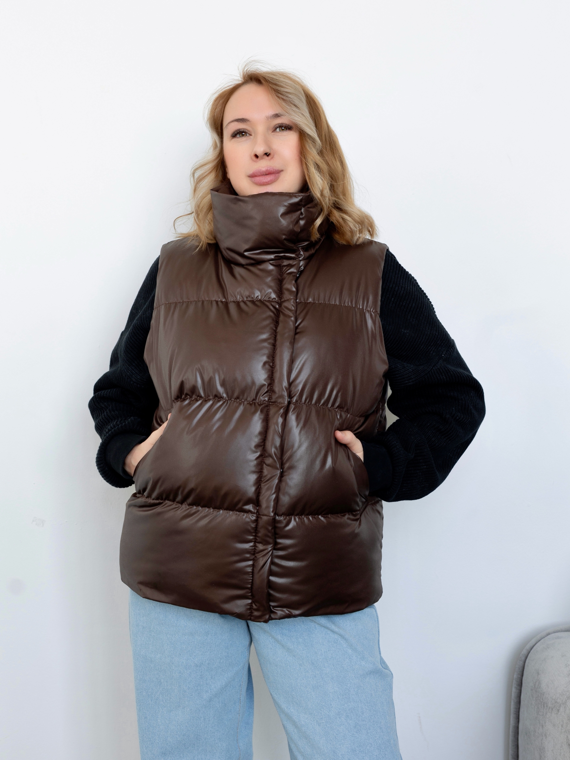 Модель Елена, жилет 44 размера рост 170 см, реальный размер (на момент фотосессии) по обхвату груди 44 рост 167 см. Параметры тела: ОГ 87 см, ОТ 72 см, ОБ 96 см. Размер выбран 44 по обхват груди. Ткань верха — курточная ткань дюспо с блеском, утеплитель — слайтекс 100 гр + лебяжий искусственный пух, на подкладке поливискозная подкладочная ткань. Также на Елене свитер по выкройке свитшота «Эрин», джинсы по выкройке «Донна», толстовка по выкройке «Аника» и брюки по выкройке «Лавиния».
