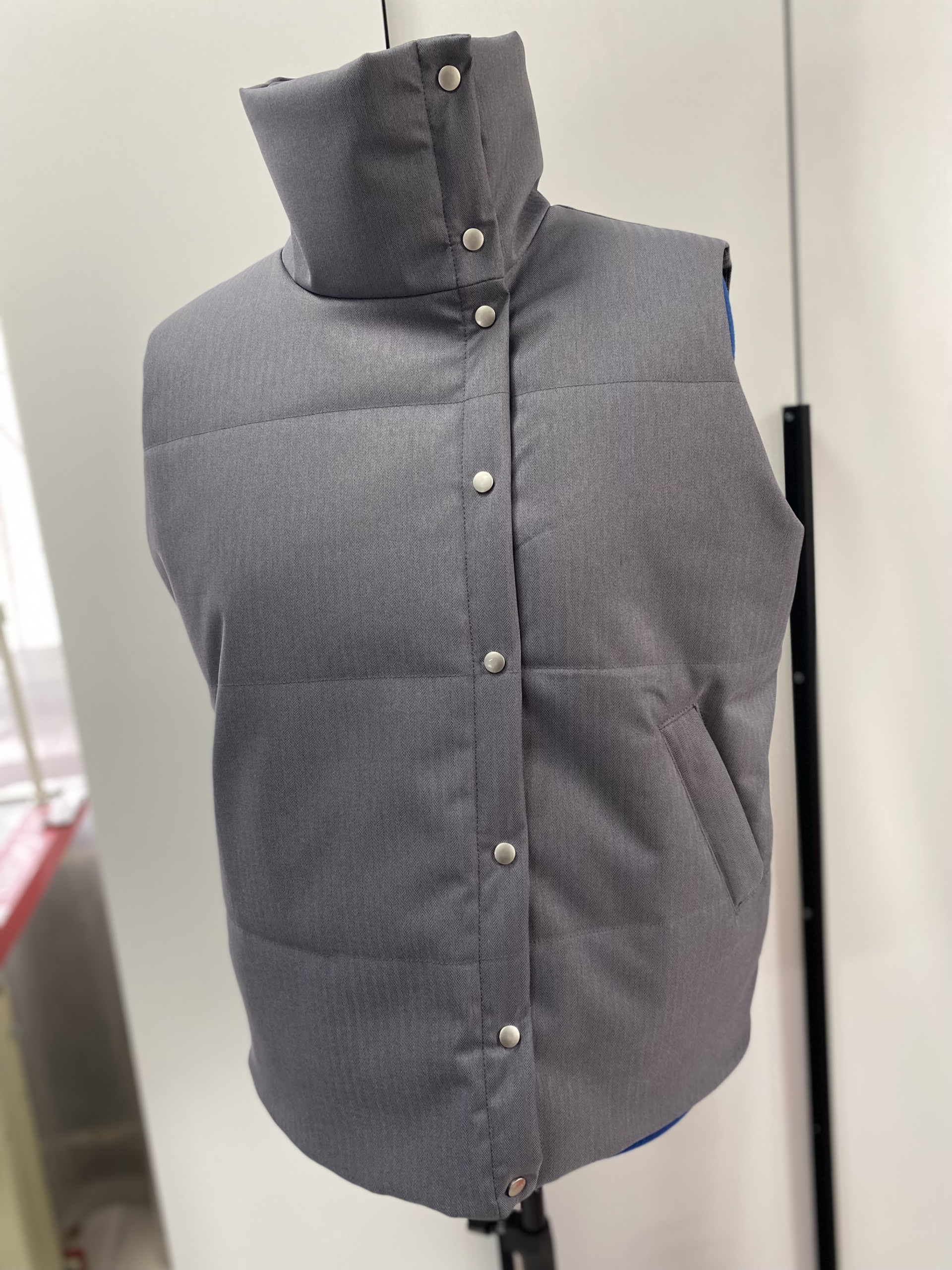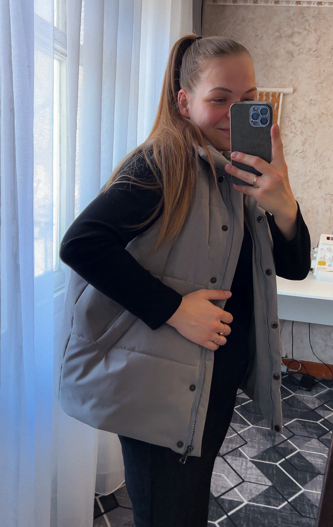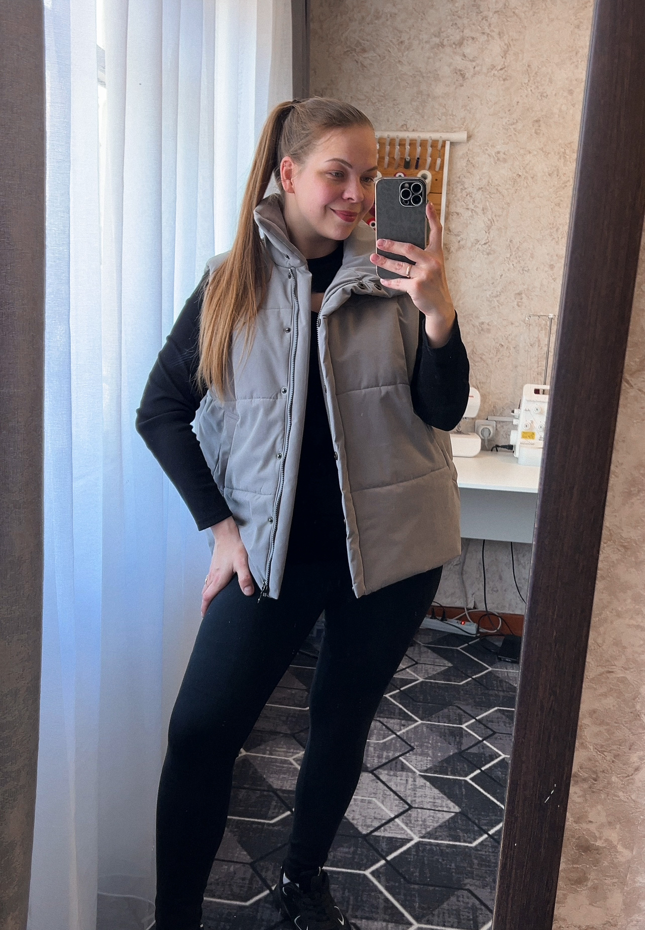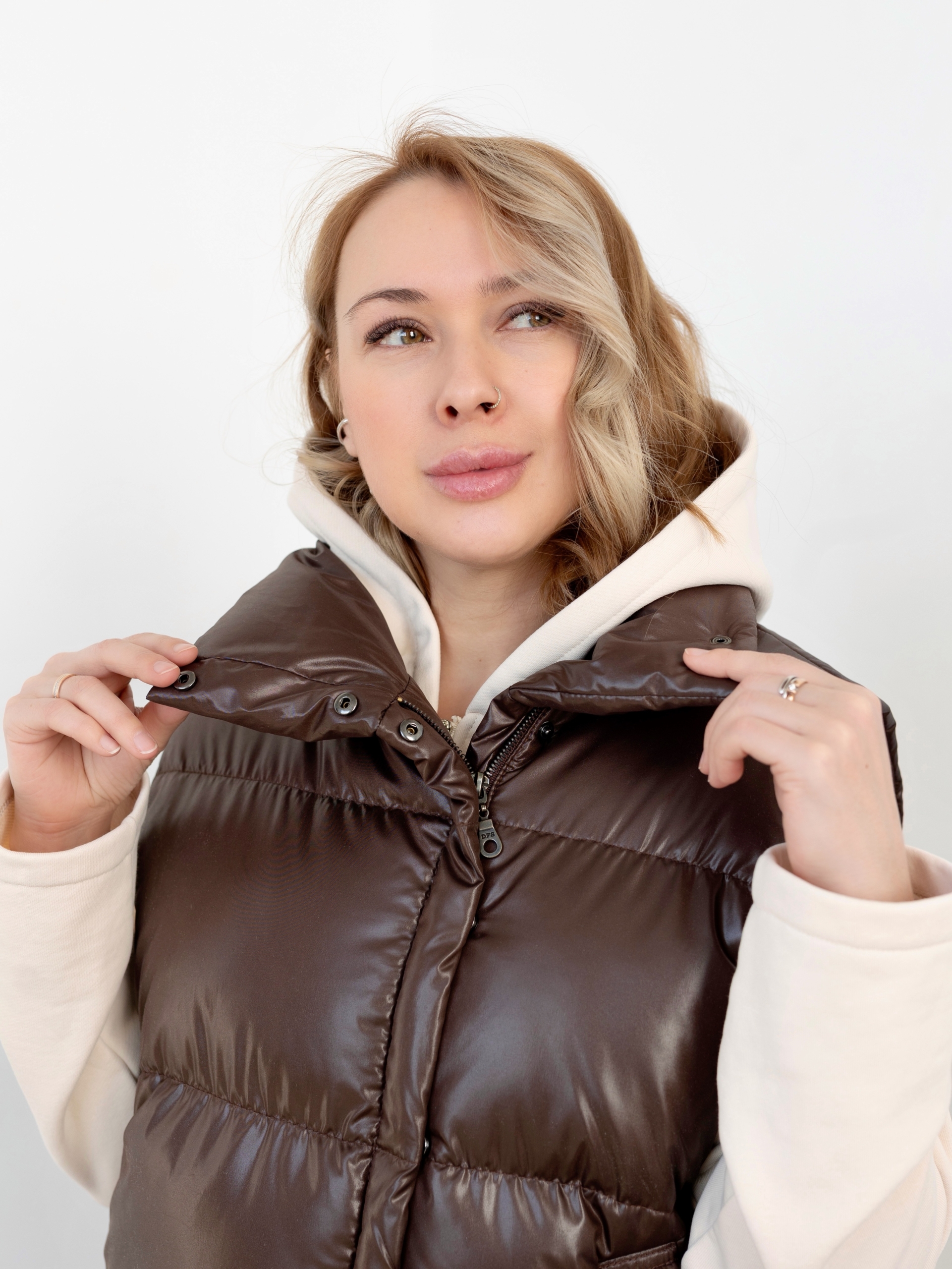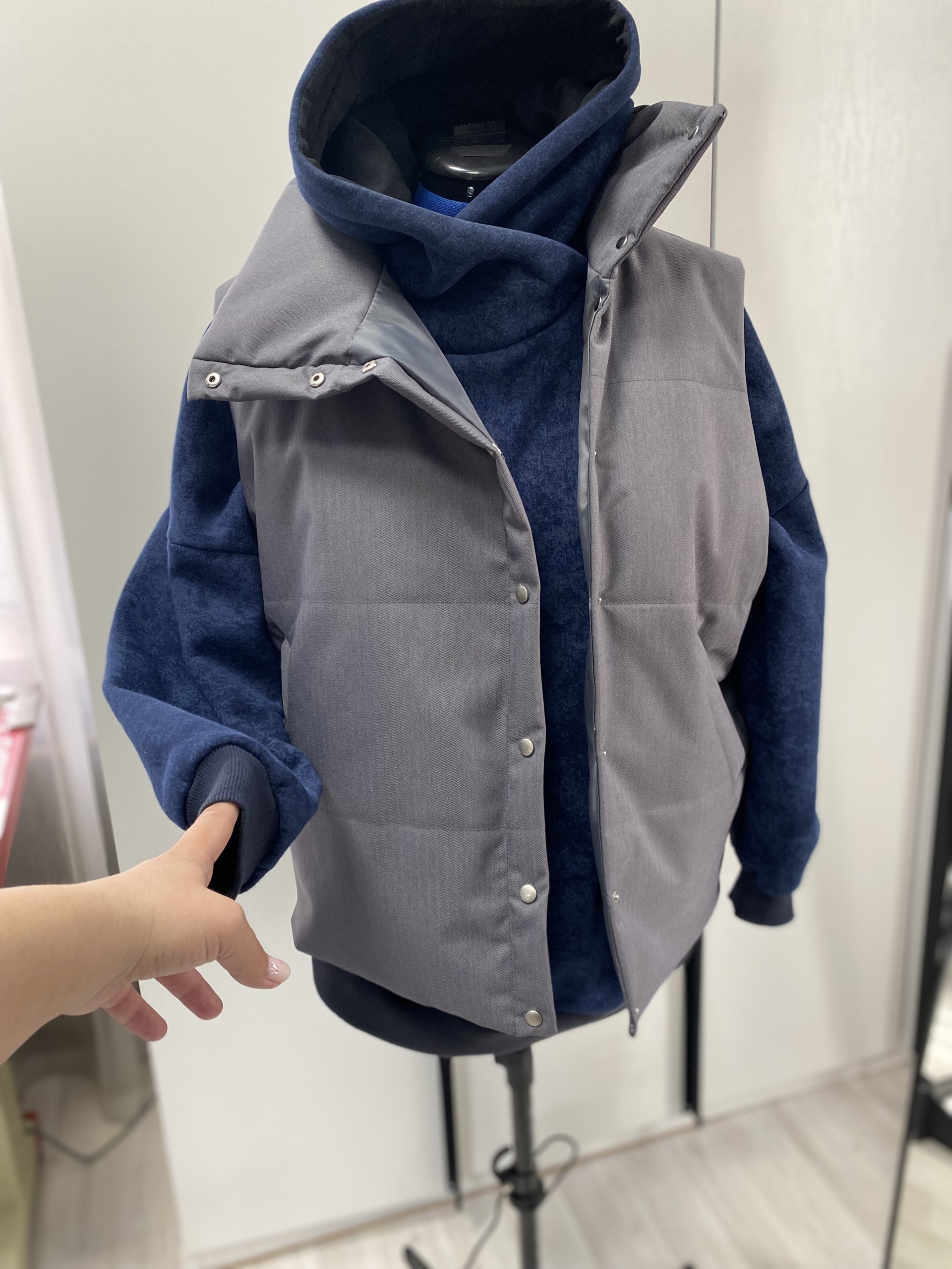 Модель Елена, жилет 44 размера рост 170 см, реальный размер (на момент фотосессии) по обхвату груди 44 рост 167 см. Параметры тела: ОГ 87 см, ОТ 72 см, ОБ 96 см. Размер выбран 44 по обхват груди. Ткань верха — курточная ткань дюспо с блеском, утеплитель — слайтекс 100 гр + лебяжий искусственный пух, на подкладке поливискозная подкладочная ткань. Также на Елене свитер по выкройке свитшота «Эрин», джинсы по выкройке «Донна», толстовка по выкройке «Аника» и брюки по выкройке «Лавиния».