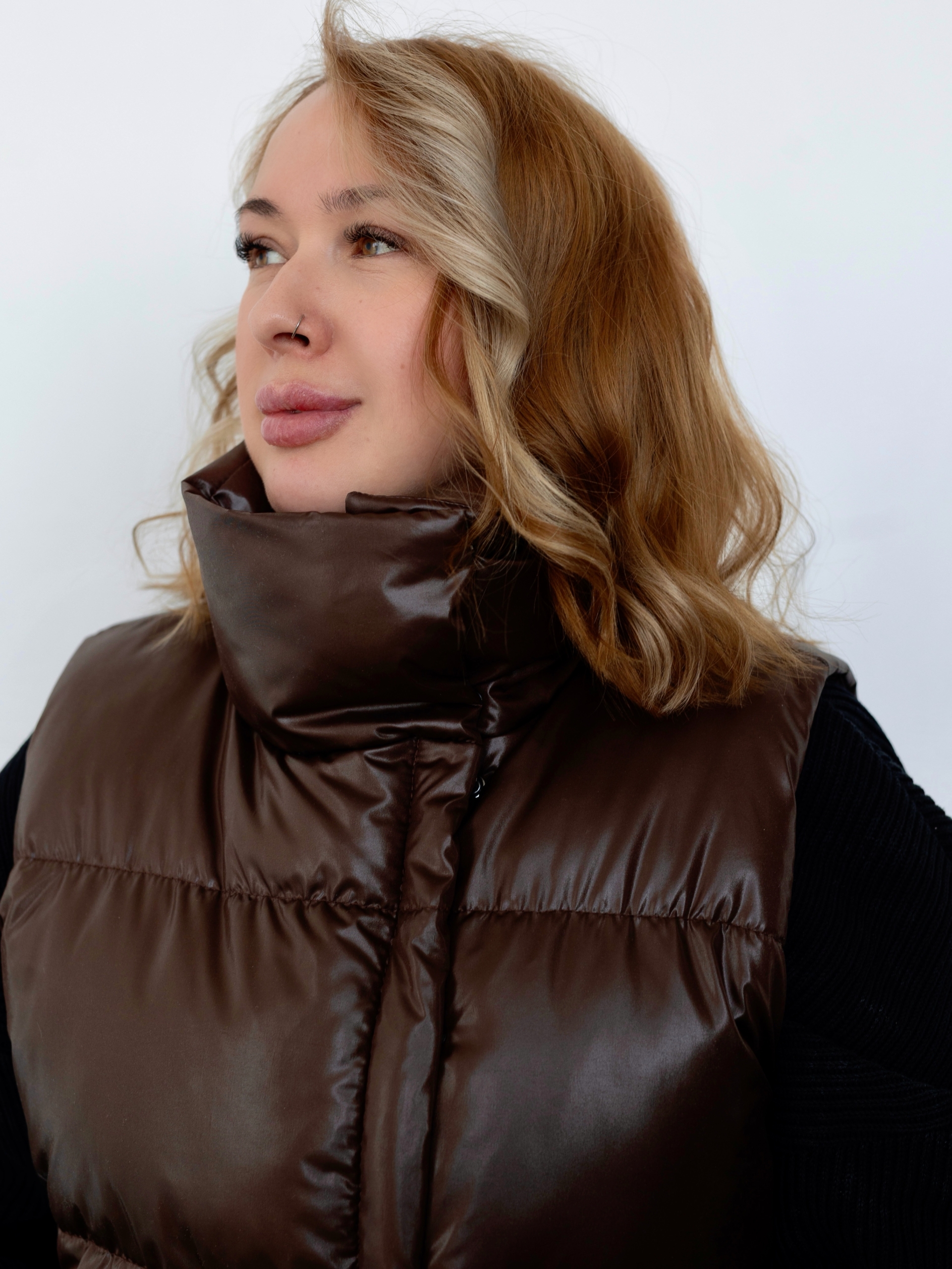 Модель Виктория, жилет 54 размера рост 176 см, реальный размер (на момент фотосессии) 54 рост 173 см. Параметры тела: ОГ 108 см, ОТ 95 см, ОБ 119 см. Размер выбран по обхвату груди. Ткань верха — курточная ткань дюспо с блеском, утеплитель — слайтекс 100 гр + лебяжий искусственный пух, на подкладке поливискозная подкладочная ткань. Также на Виктории бомбер по выкройке «Рианнон», брюки по выкройке «Богдана».